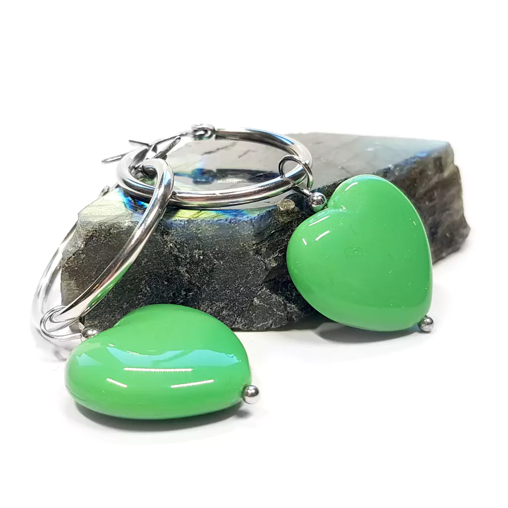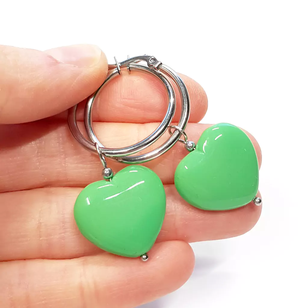 Kolczyki wykonane ręcznie z elementów metalowych ze stali chirurgicznej oraz szklanych serc w kolorze zielonym.