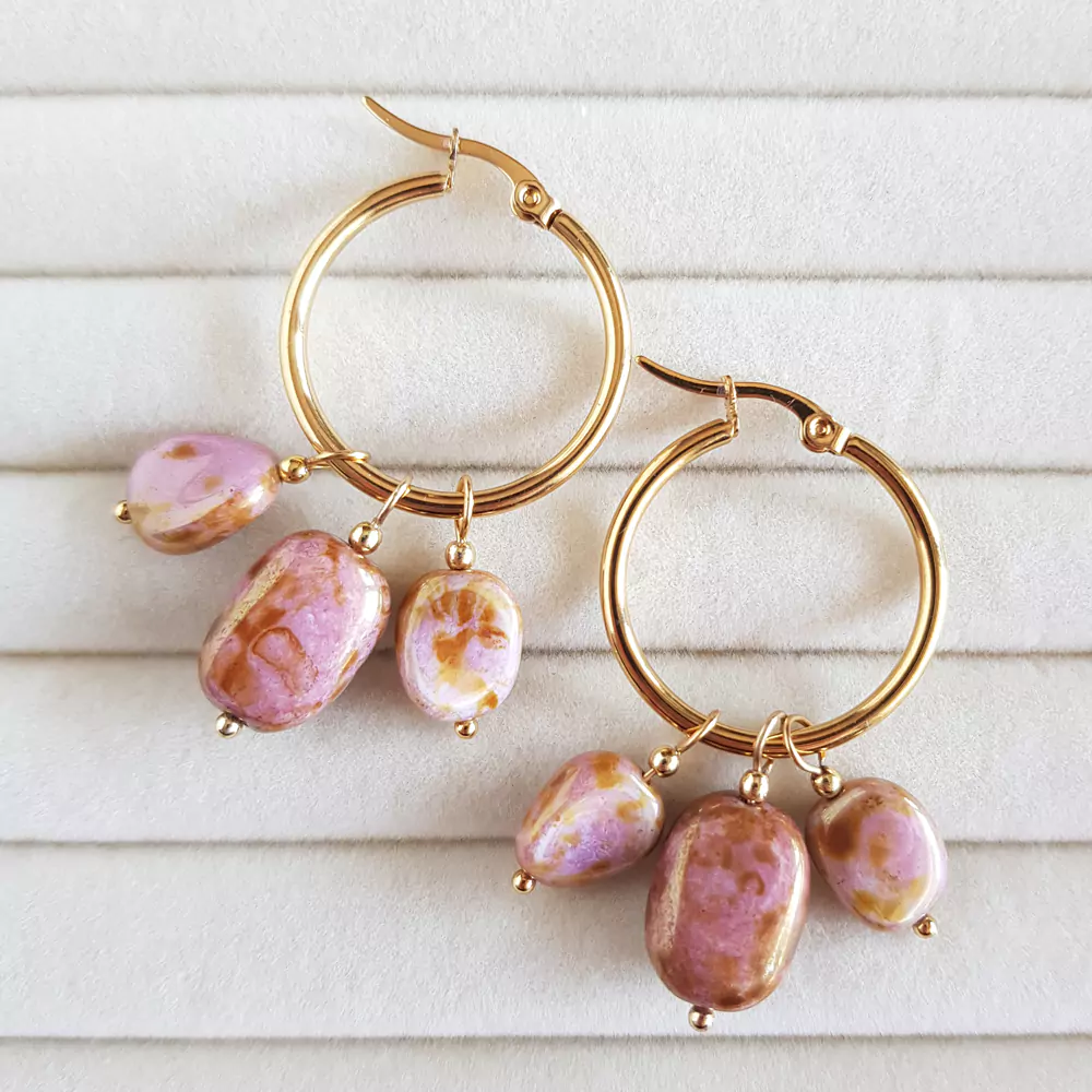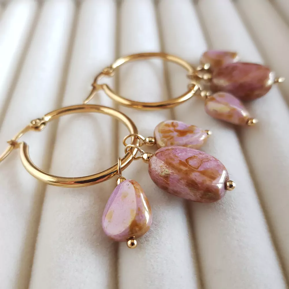 Kolczyki wykonane ręcznie z elementów metalowych ze stali chirurgicznej oraz szklanych pastylek.