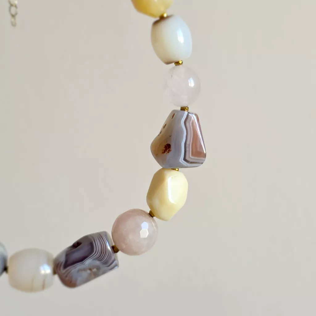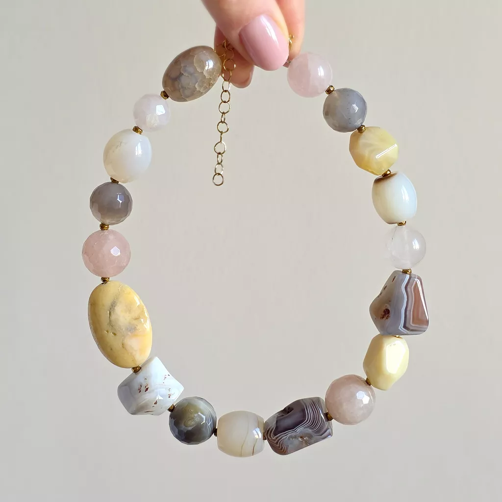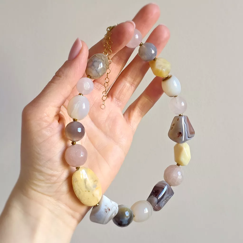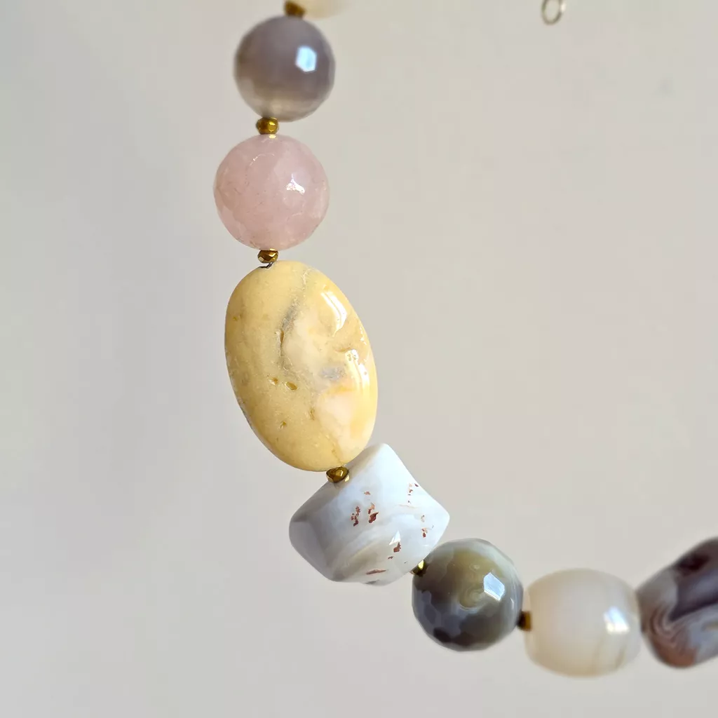 Bohemian naszyjnik kolia unikat kwarc różowy, agat botswana, agat szary, agat żółty, opal żółty i hematyt