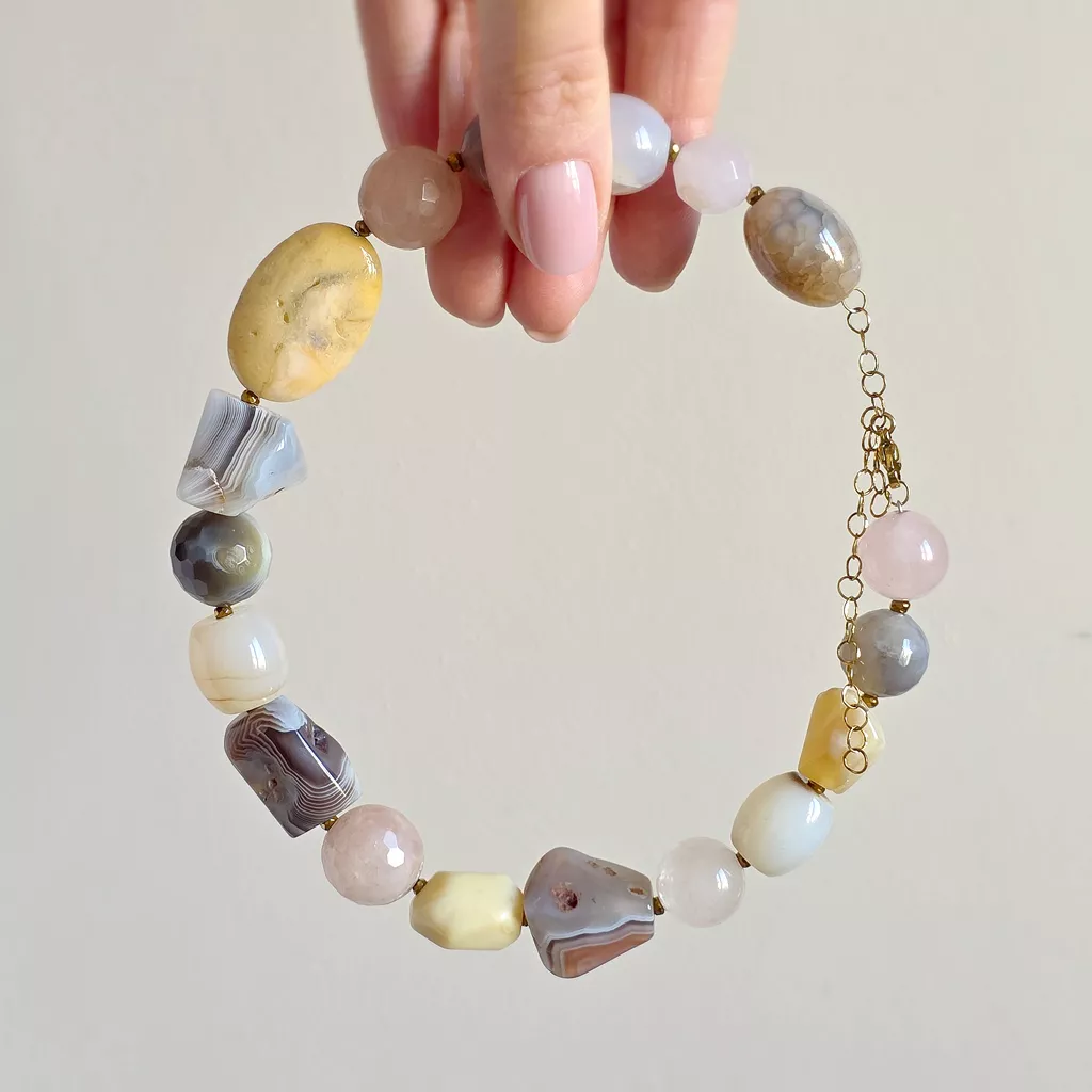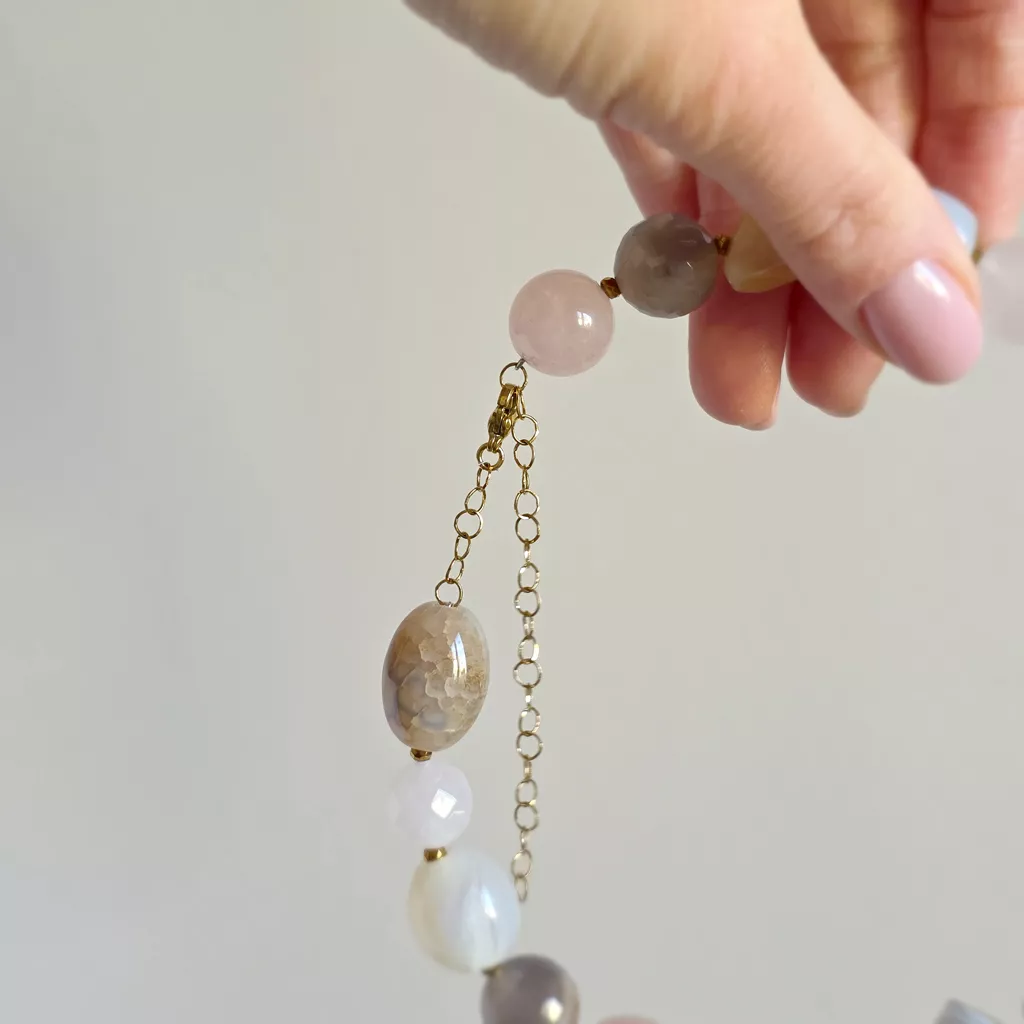 Kolia z kolekcji Bohemian to harmonijna kompozycja naturalnych kamieni w ciepłych, ziemistych barwach przełamanych subtelnym różem kwarcu. Połączenie kwarcu różowego, agatu Botswana, agatu szarego, agatu żółtego, opalu żółtego i hematytu tworzy biżuterię pełną spokoju, światła i naturalnej elegancji.