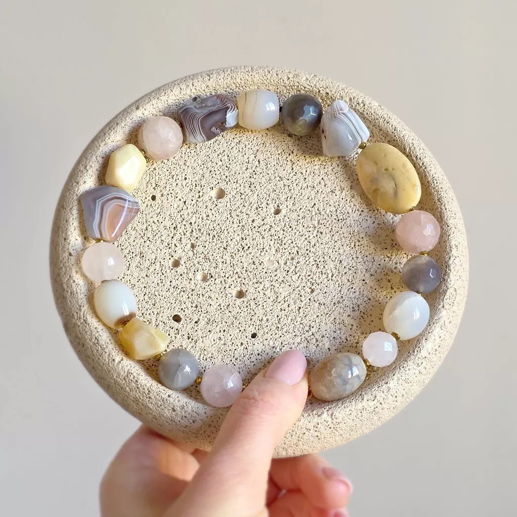 Agat Botswana przynosi energię spokoju i stabilności. Pomaga uporządkować emocje, wspiera cierpliwość i wprowadza poczucie równowagi.