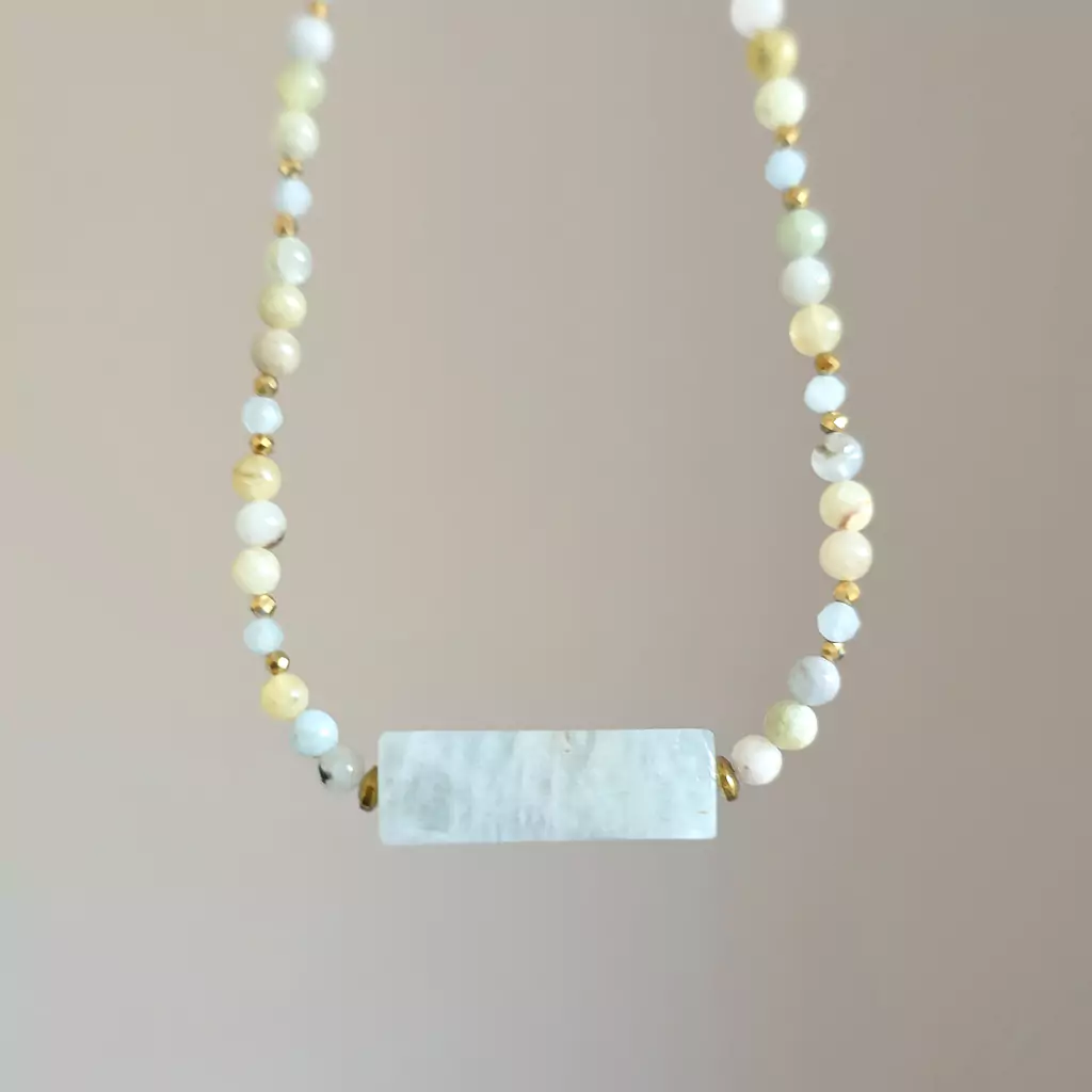 Naszyjnik wykonany z kamieni naturalnych - akwamarynu w przepięknych odcieniach błękitów i zieleni i hematytu oraz elementów metalowych z pozłacanej stali chirurgicznej.