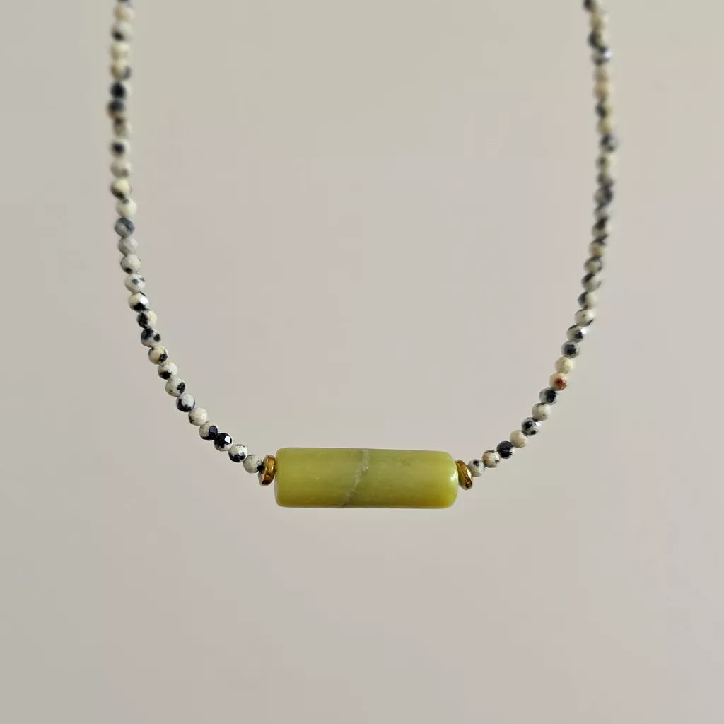 Naszyjnik wykonany z kamieni naturalnych - wałeczka jadeitu, 2 mm kuleczek jaspisu dalmatyńskiego, oponek hematytu oraz elementów metalowych z pozłacanej stali chirurgicznej.