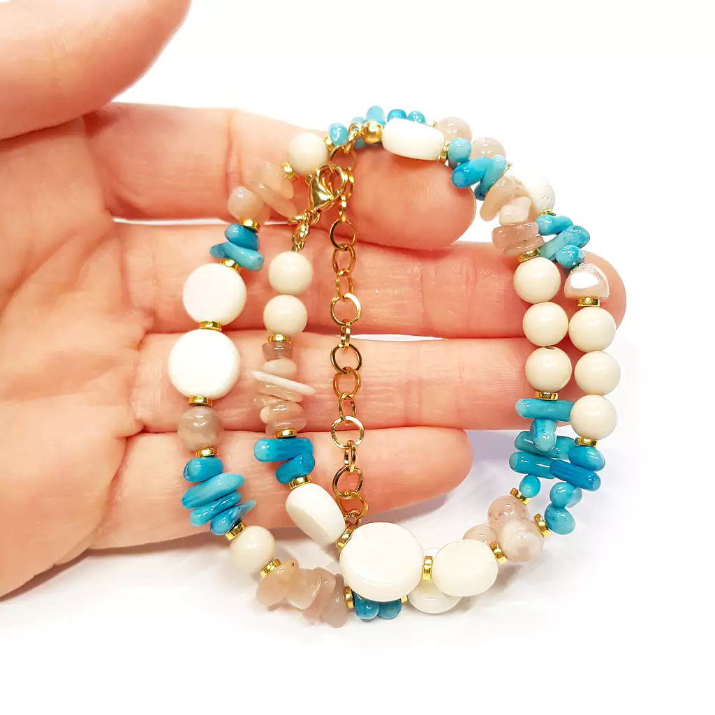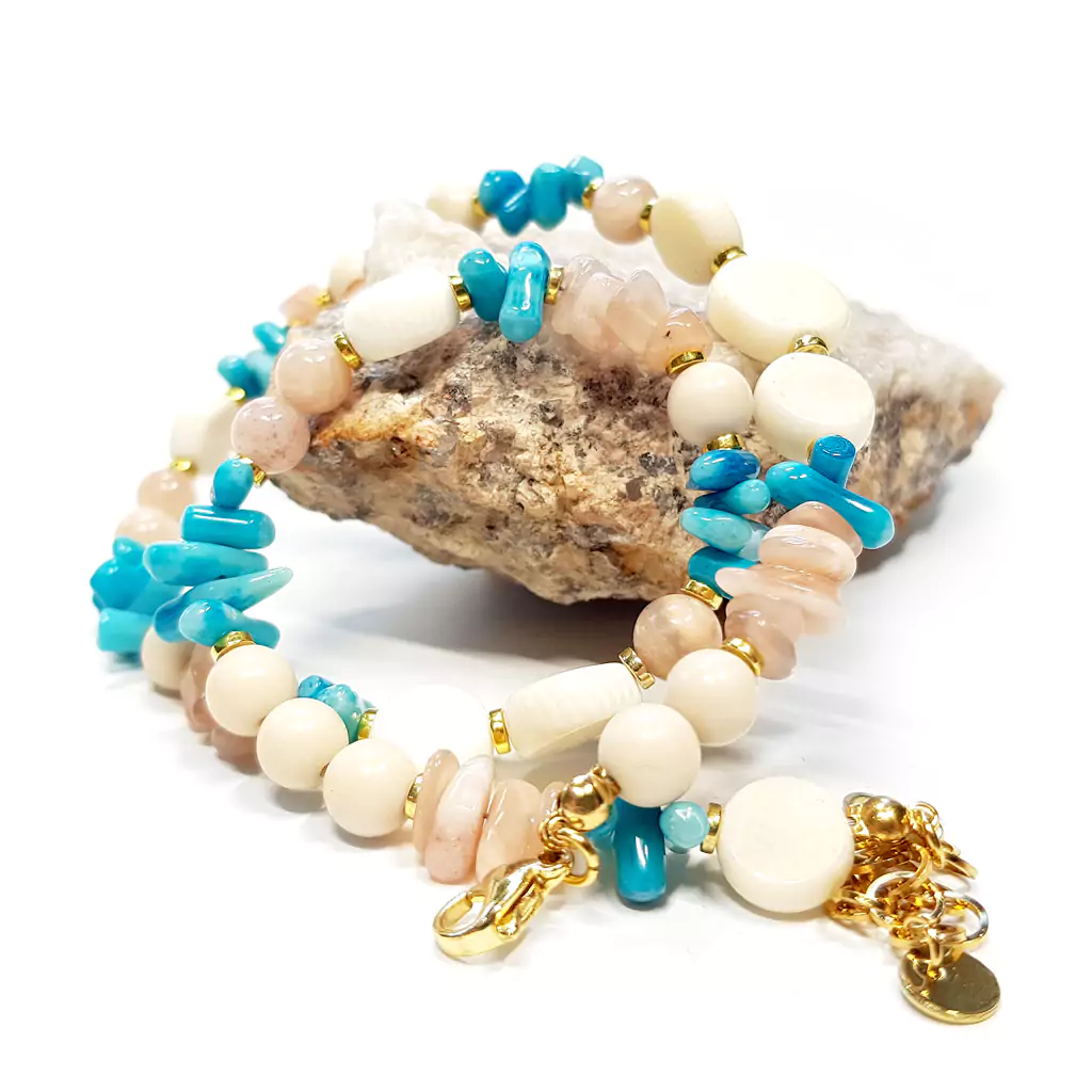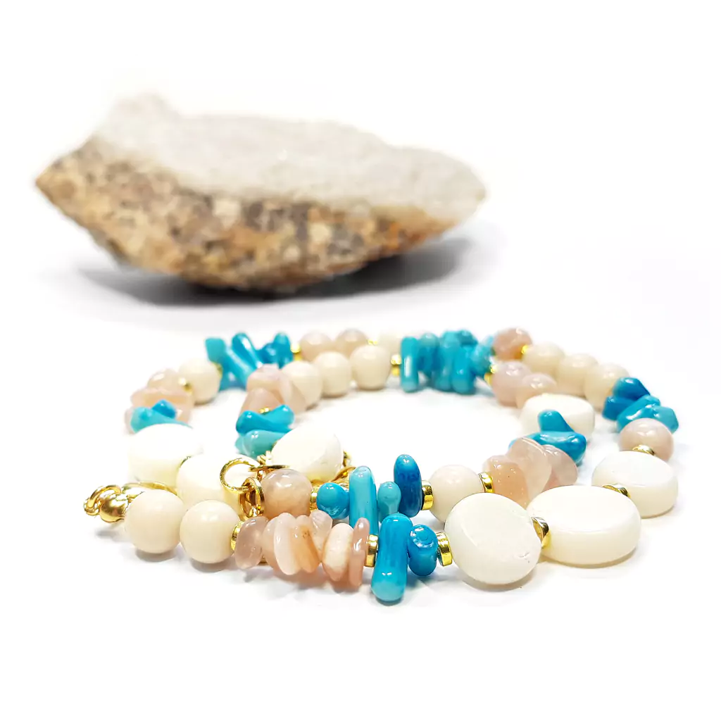 Naszyjnik wykonany korala i z kamieni naturalnych - kamienia słonecznego, kamienia rzecznego i hematytu oraz elementów metalowych z pozłacanej stali chirurgicznej.