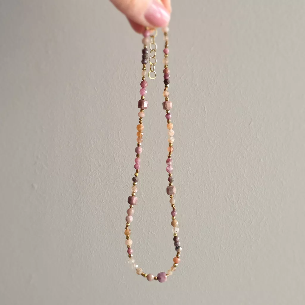 Naszyjnik unikat choker kamień słoneczny, rodonit, awenturyn pomarańczowy i hematyt