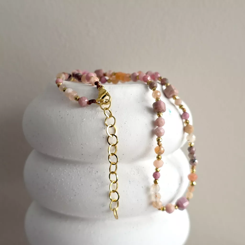 Naszyjnik wykonany z kamienia słonecznego, rodonitu, awenturynu pomarańczowego i hematytu oraz elementów metalowych z pozłacanej stali chirurgicznej. Baza naszyjnika - sznurek.