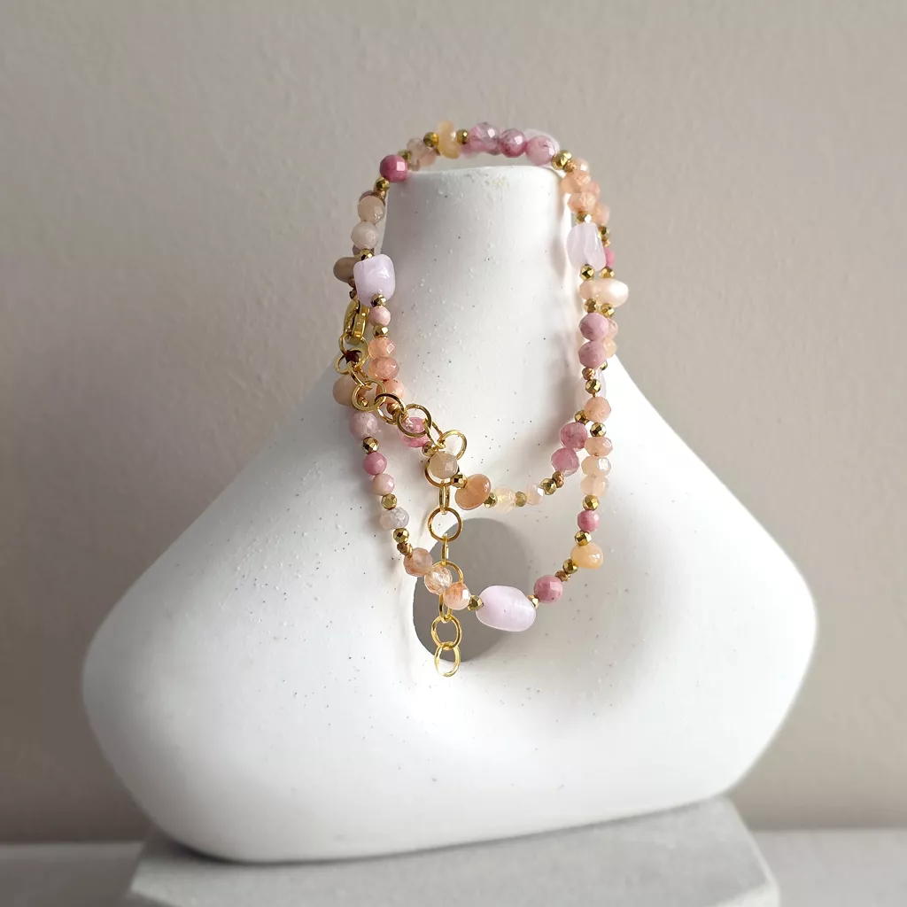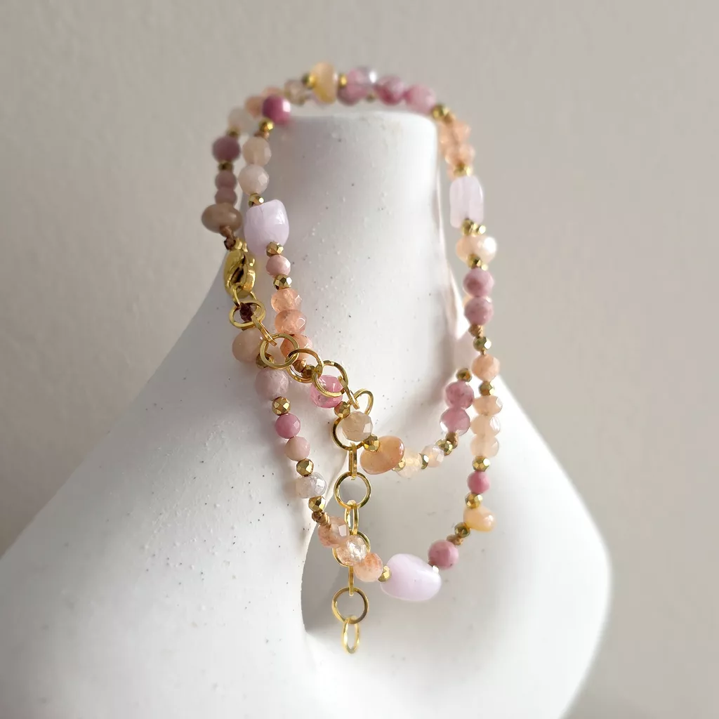 Naszyjnik wykonany z kamienia słonecznego, rodonitu, awenturynu pomarańczowego, kunzytu i hematytu oraz elementów metalowych z pozłacanej stali chirurgicznej. Baza naszyjnika - sznurek.