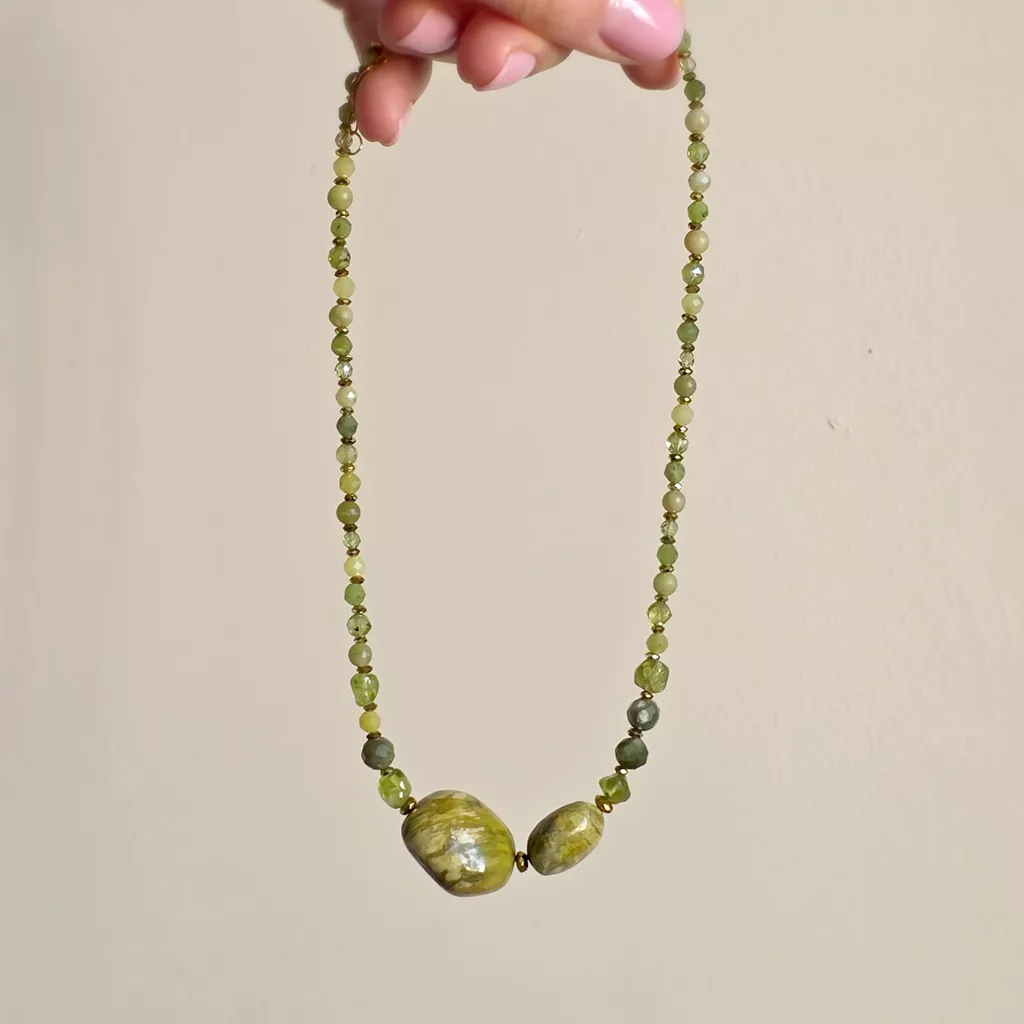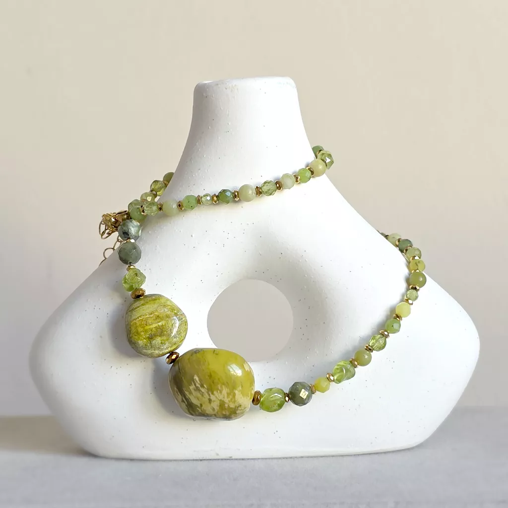 Unikatowy choker został wykonany z kamieni w zgaszonych, roślinnych odcieniach zieleni, które układają się w spokojną, harmonijną całość. W centralnej części znajdują się dwa większe, nieregularne korale nefrytu o wyraźnym rysunku i naturalnych przejściach barw od oliwki po jaśniejsze, kremowozielone tony. Po bokach pojawiają się drobniejsze kamienie: peridot o świeżym, soczystym odcieniu, jadeit w jaśniejszej, mlecznozielonej tonacji oraz niewielkie przekładki z hematytu, które subtelnie porządkują kompozycję. Naszyjnik ma lekką, blisko szyi układającą się formę typową dla chokera.
