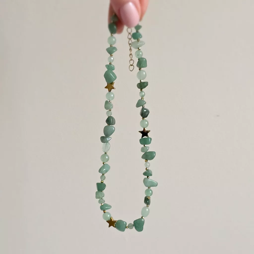 Unikatowy naszyjnik typu choker z awenturynu i hematytu to biżuteria inspirowana naturalnymi formami kamieni. Nieregularne fragmenty awenturynu tworzą organiczną, autentyczną strukturę, którą subtelnie podkreślają metaliczne akcenty hematytu.