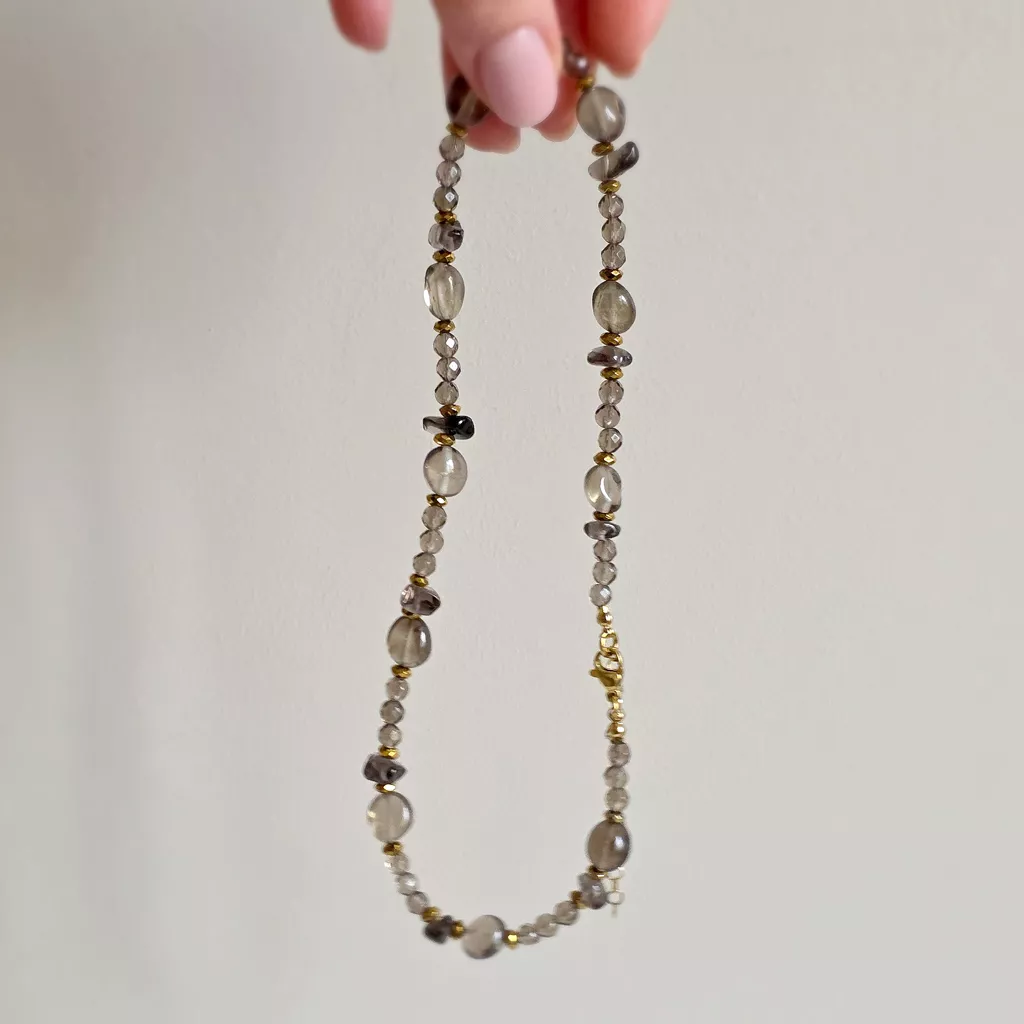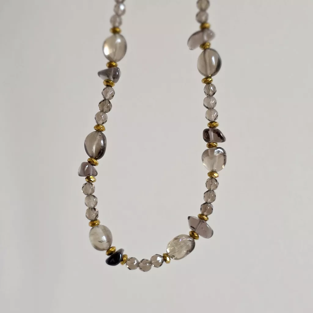 Ten unikatowy naszyjnik typu choker to minimalistyczna, ale bardzo wyrazista kompozycja naturalnych kamieni. Nieregularny kwarc dymny w połączeniu z hematytowymi akcentami tworzy biżuterię o surowym, eleganckim charakterze inspirowanym naturą.