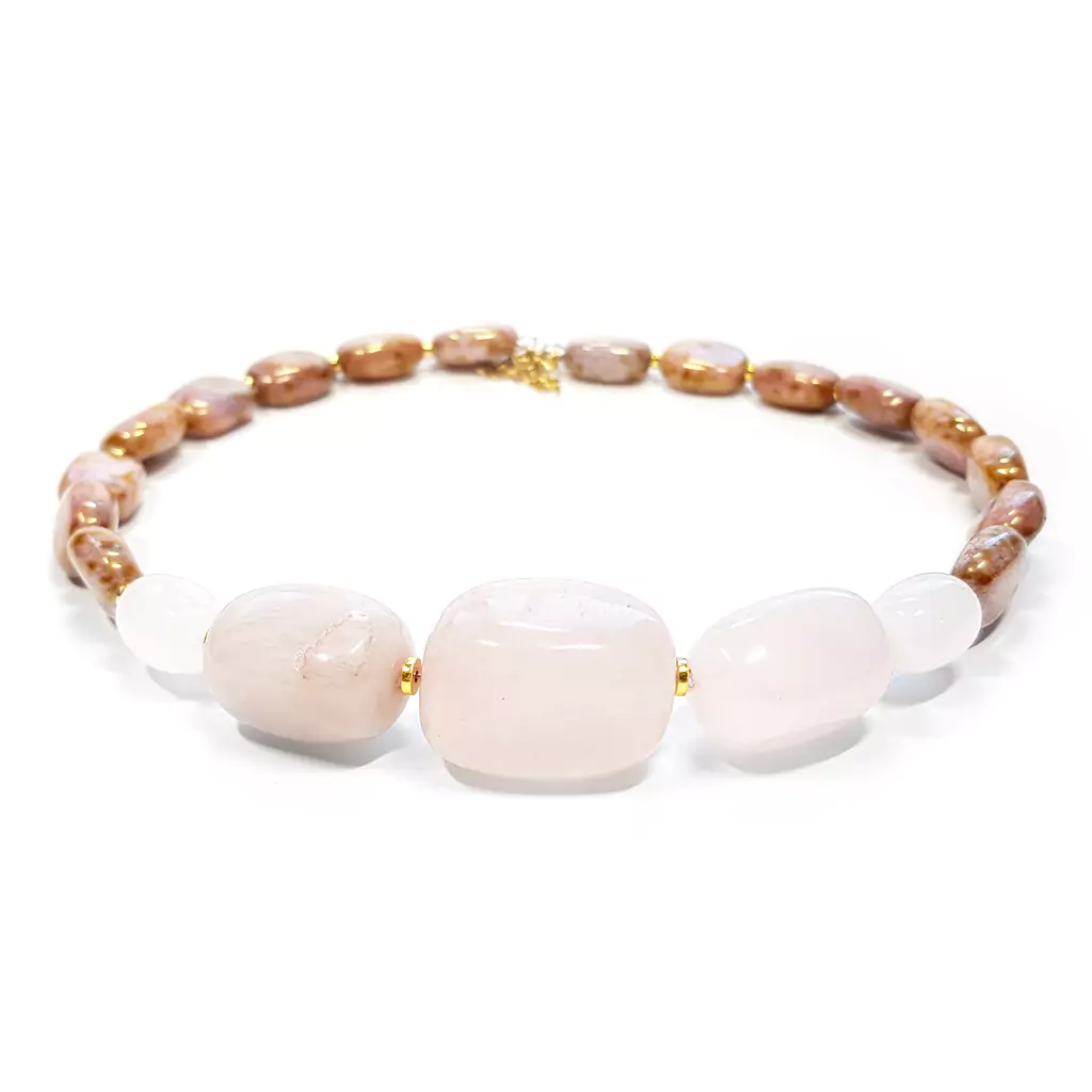 Naszyjnik wykonany z kamieni naturalnych - dużych bryełk kwarcu różowego (1,4-2,5 cm) i talarków hematytu, szklanych koralików oraz elementów metalowych ze stali chirurgicznej.