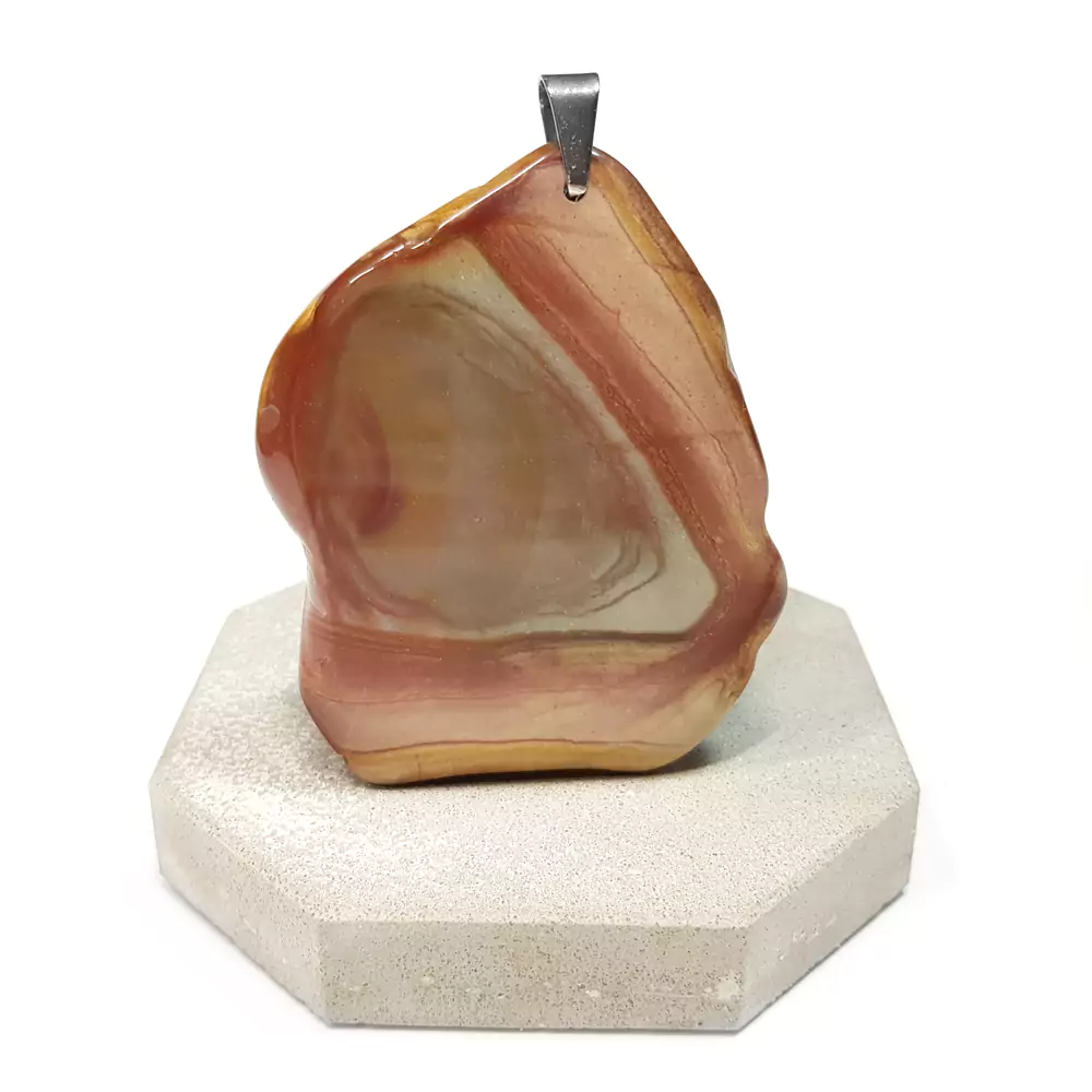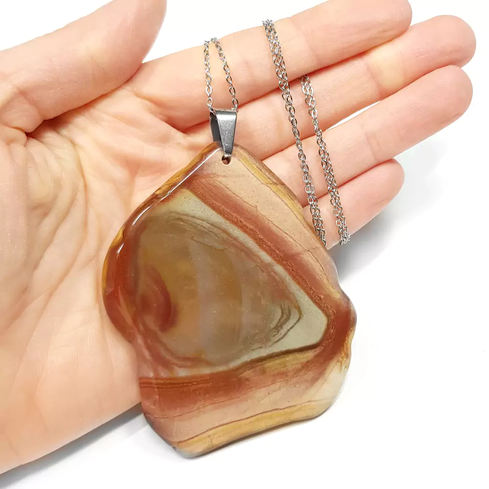 Naszyjnik wykonany z plastra jaspisu polichromowego oraz łańcuszka ze stali chirurgicznej.