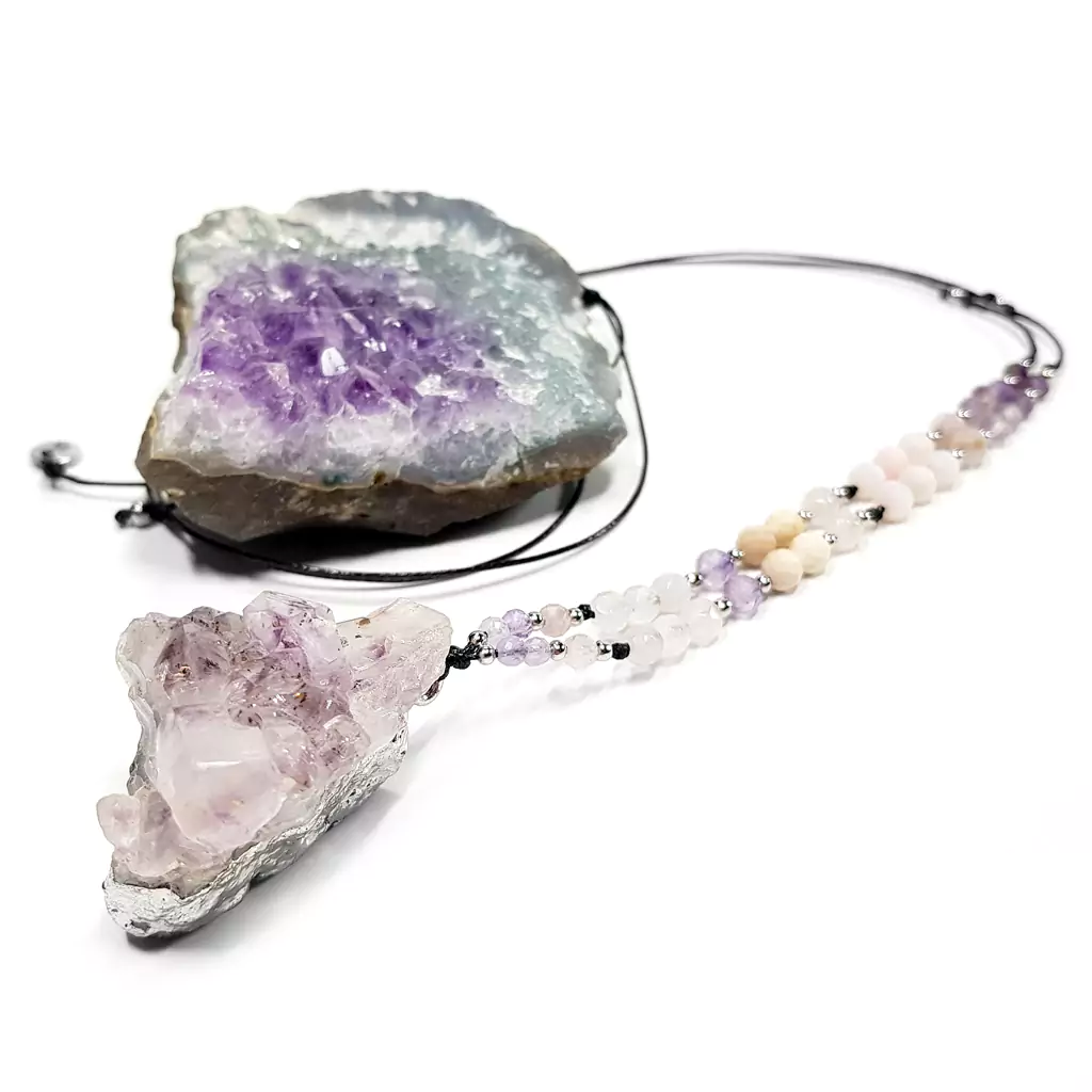 Naszyjnik unikat regulowany ametyst, kunzyt, kwarc różowy, mokait i opal różowy