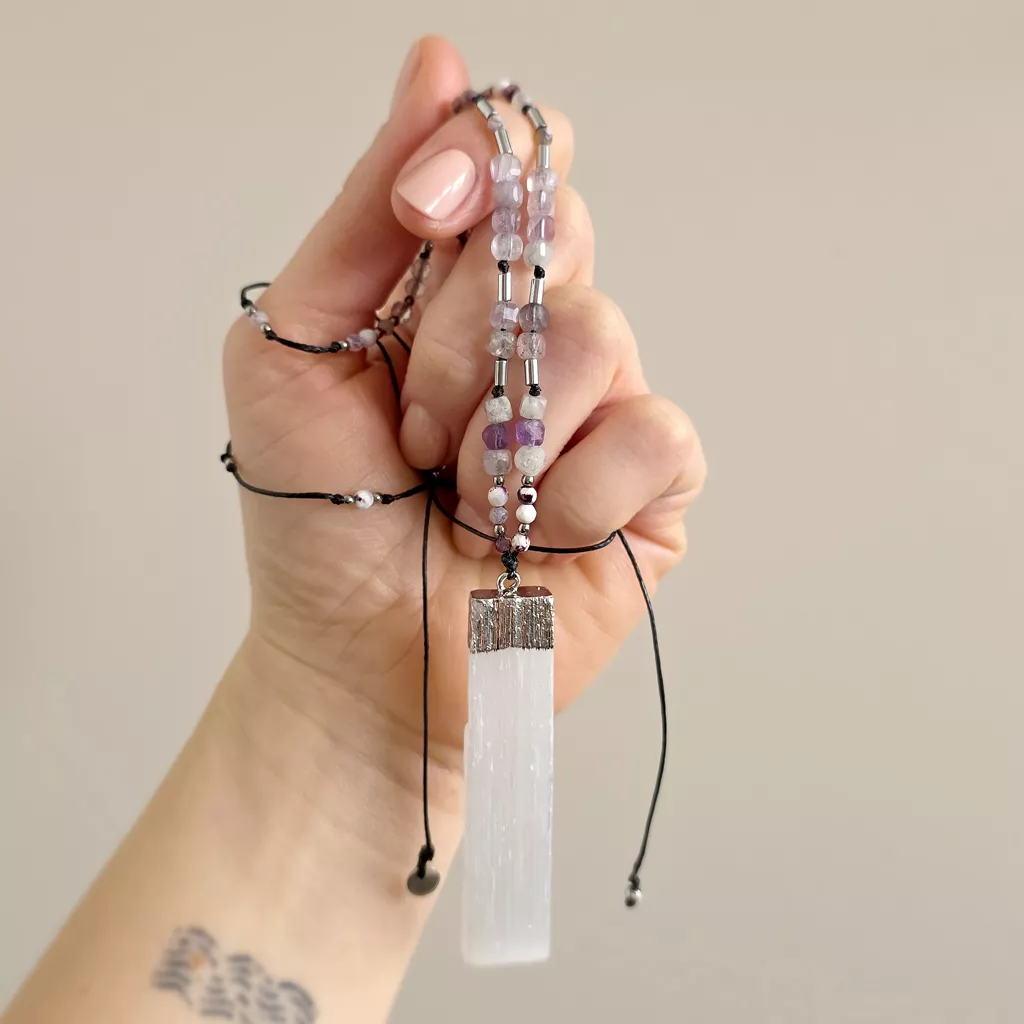 Naszyjnik unikat regulowany selenit, agat, fluoryt, kryształ górski i hematyt na czarnym sznurku