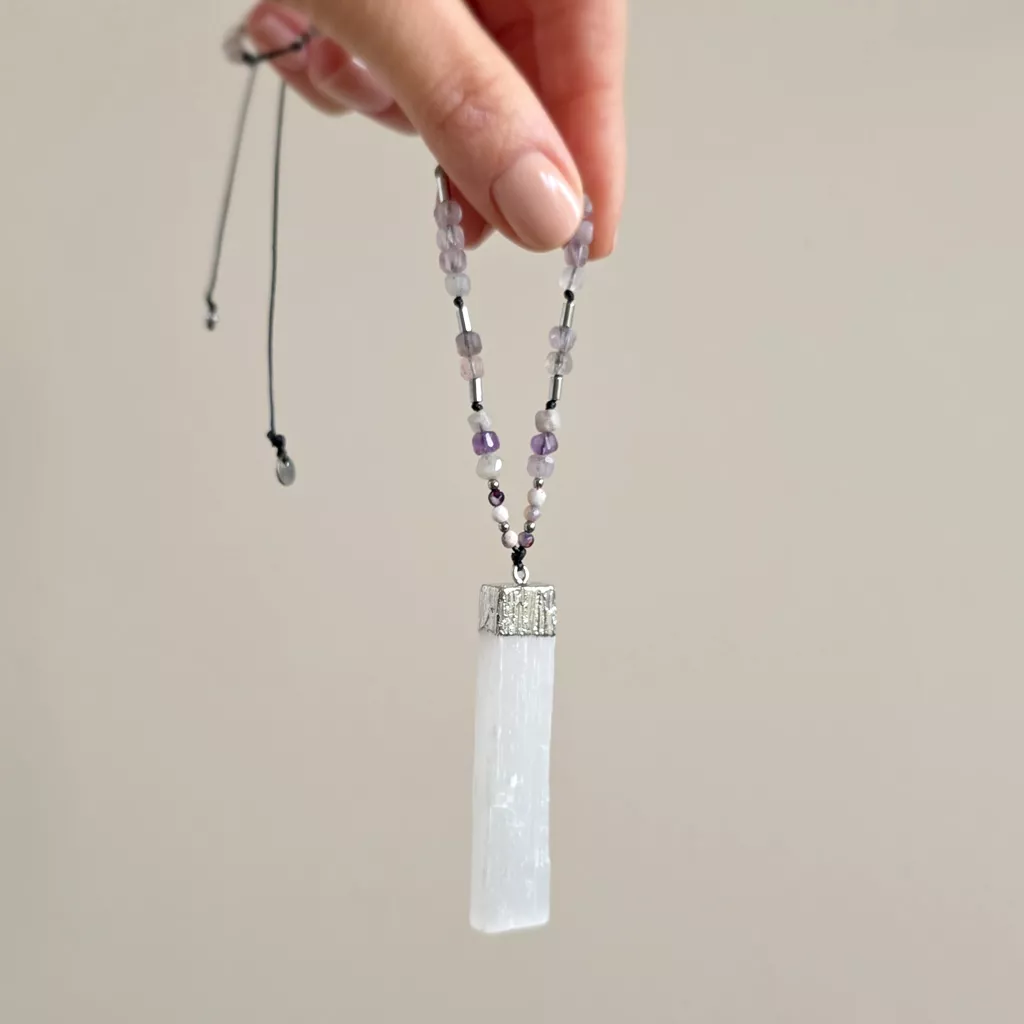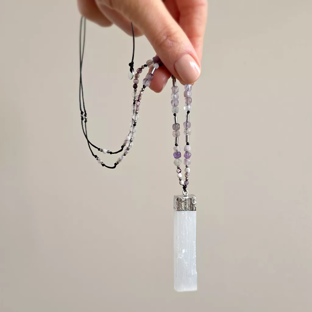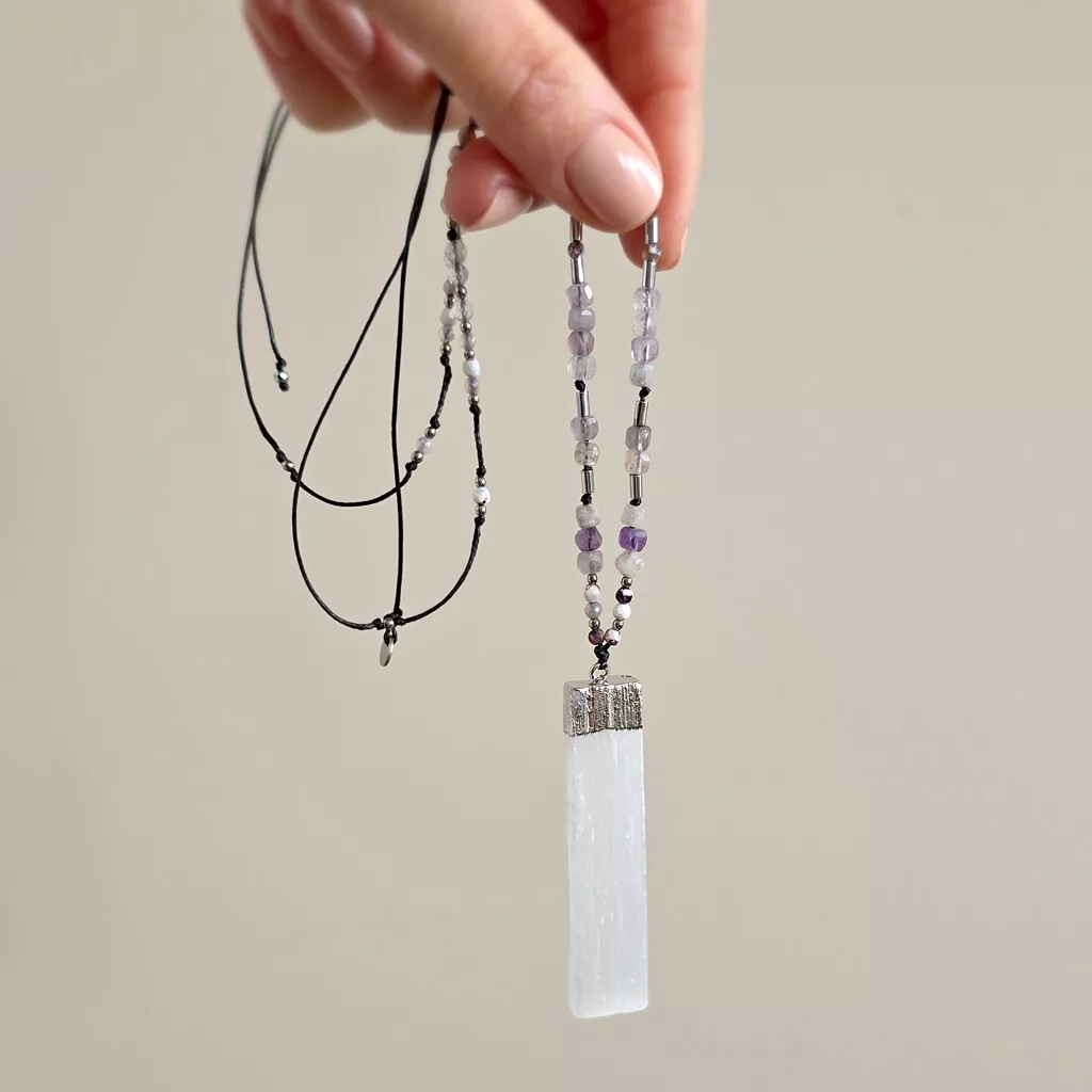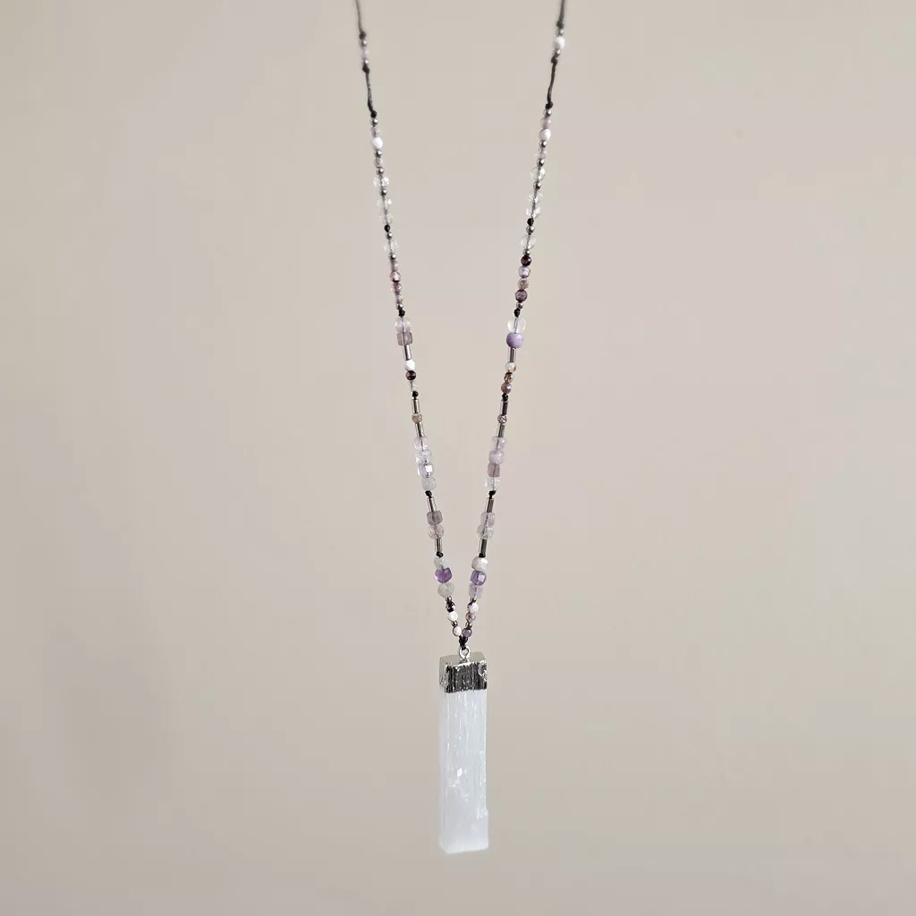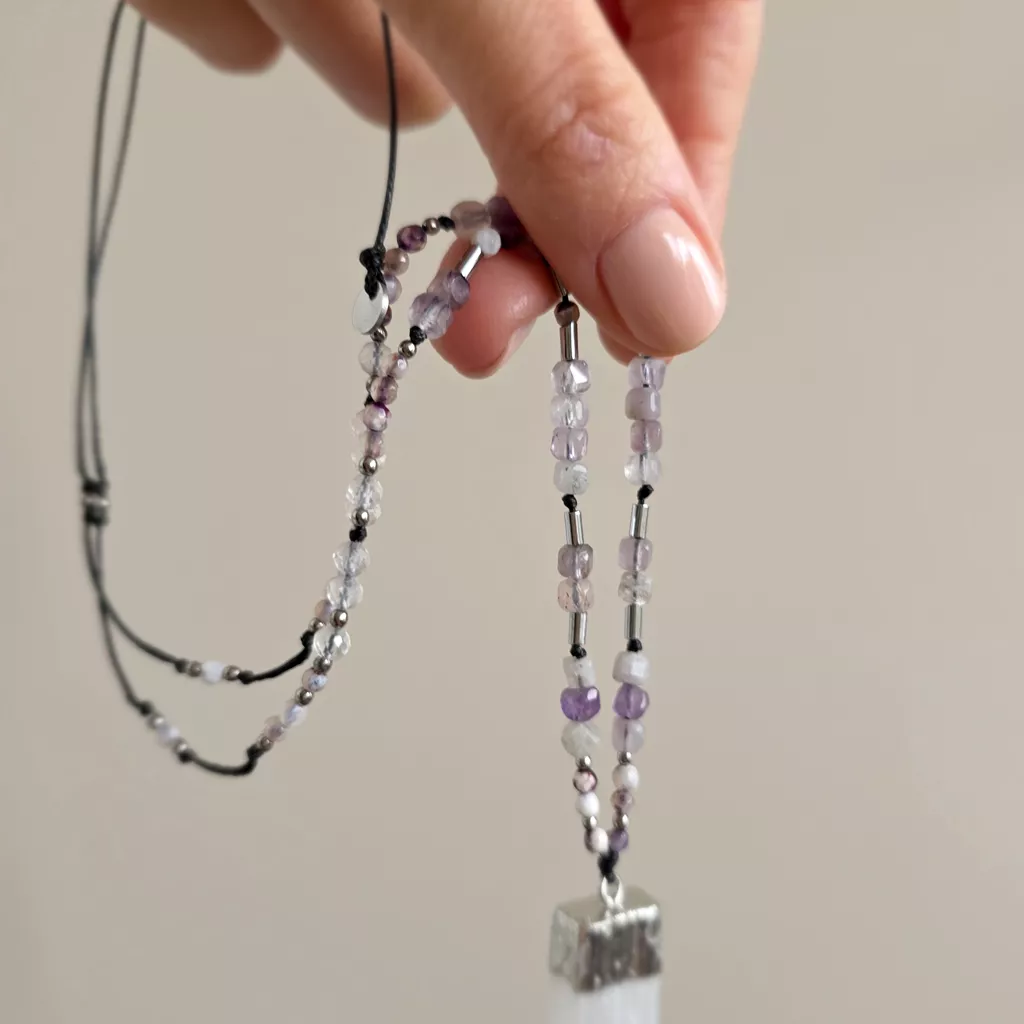 Naszyjnik wykonany z kamieni naturalnych - selenitu, agatu, fluorytu, kryształu górskiego i hematytu oraz mocnego, nylonowego sznurka.