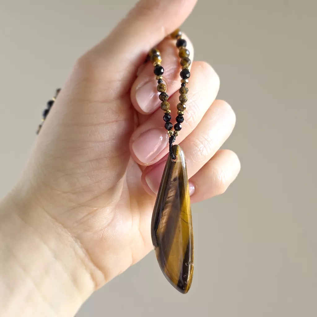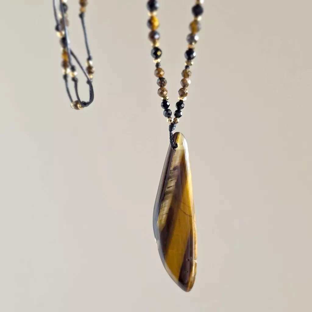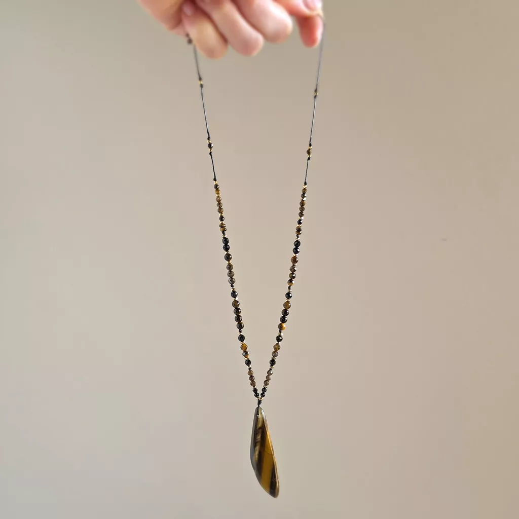 Naszyjnik unikat regulowany tygrysie oko, czarny turmalin, oolit żelazisty i hematyt