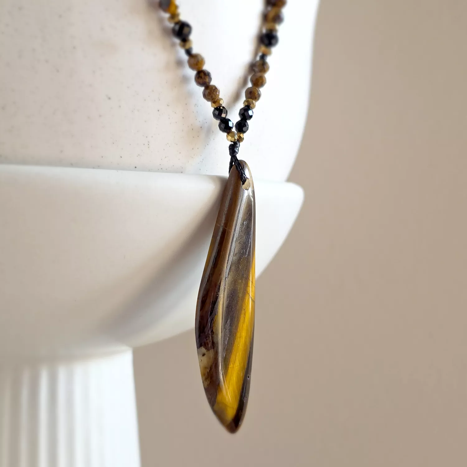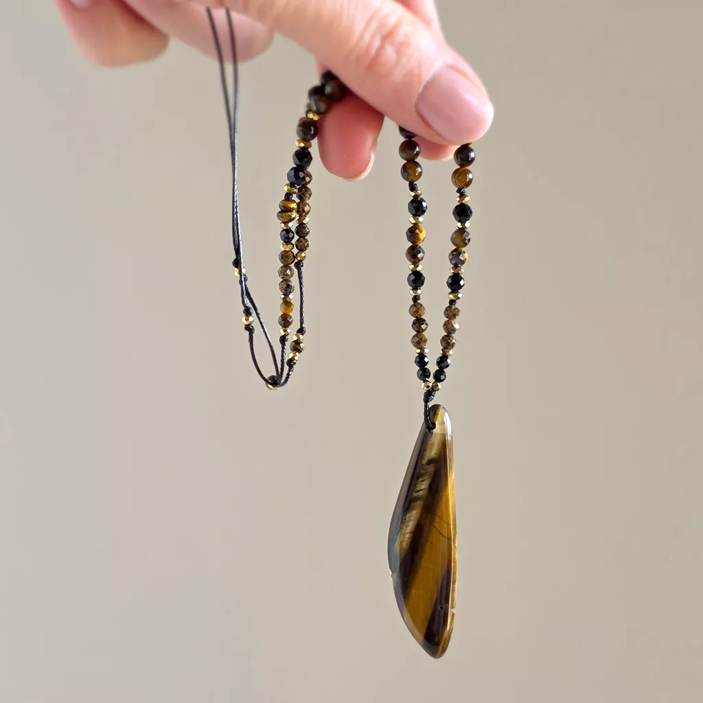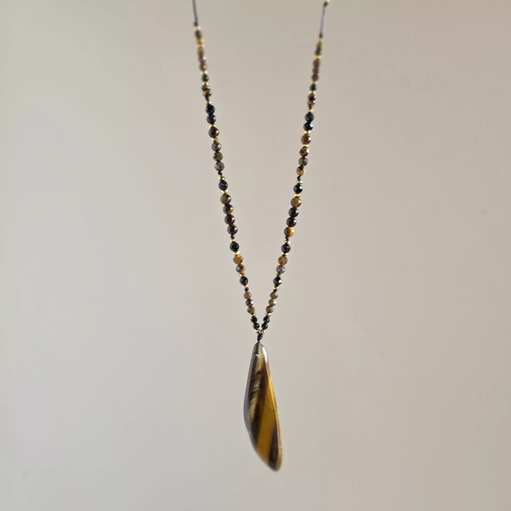 Naszyjnik unikat regulowany tygrysie oko, czarny turmalin, oolit żelazisty i hematyt