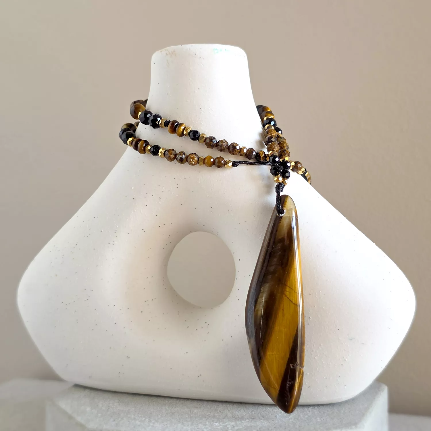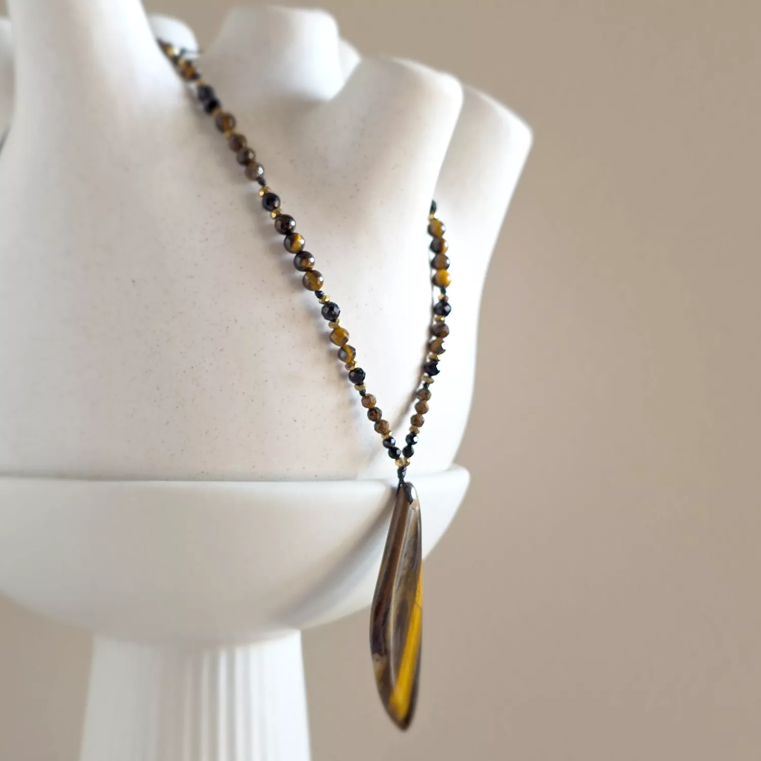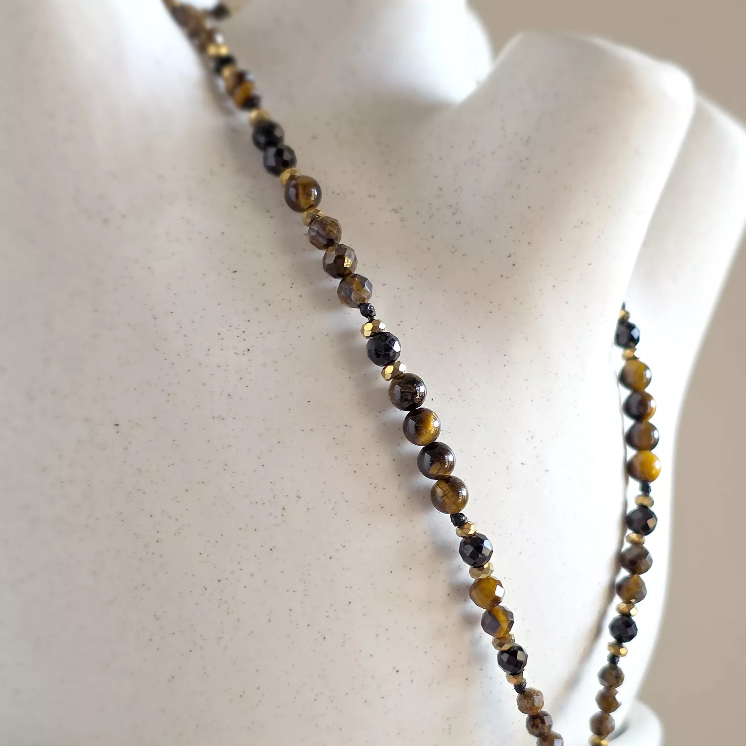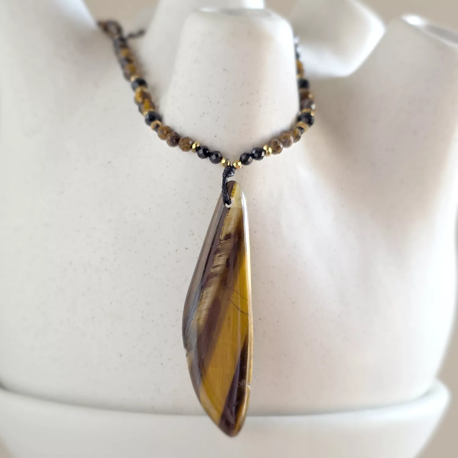 Naszyjnik wykonany z kamieni naturalnych - tygrysiego oka, czarnego turmalinu, oolitu żelazistego i hematytu oraz mocnego, nylonowego sznurka.