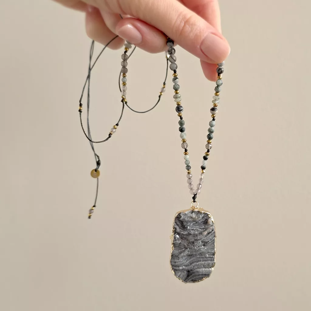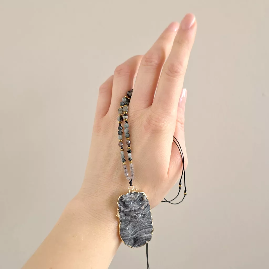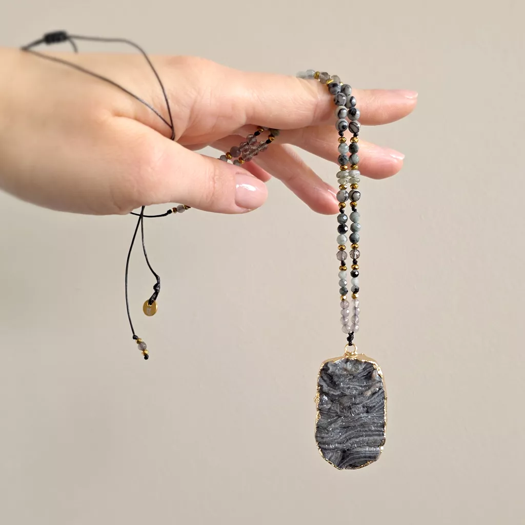 Naszyjnik regulowany unikat agat druza, jadeit, orle oko, jaspis żyłkowy, labradoryt, kwarc dymny i hematyt na czarnym sznurku v.2