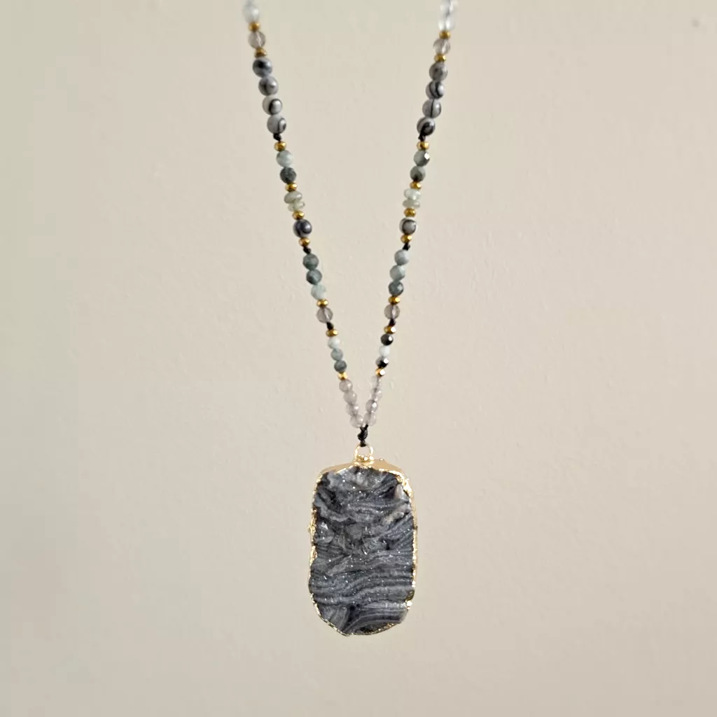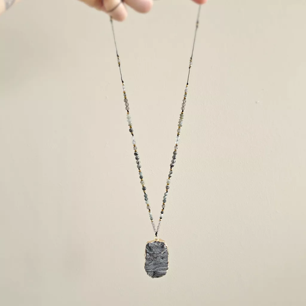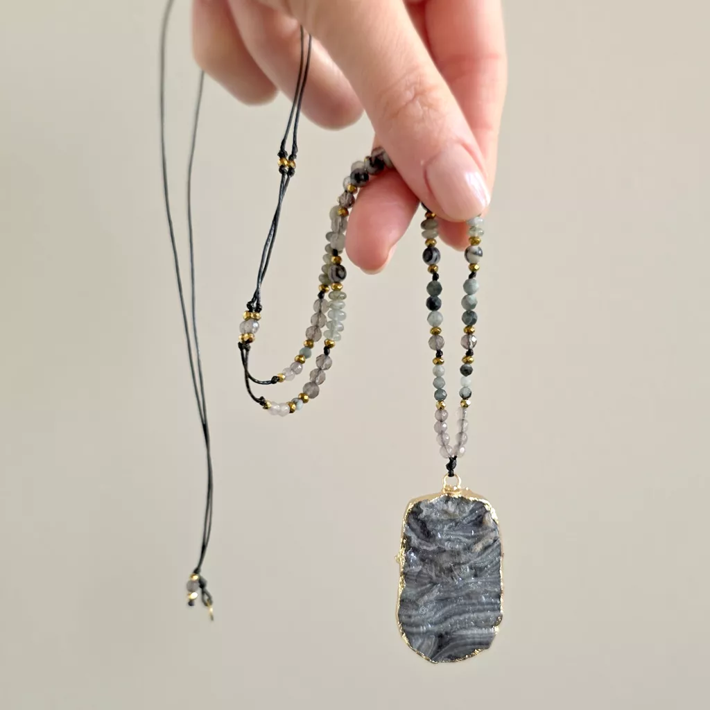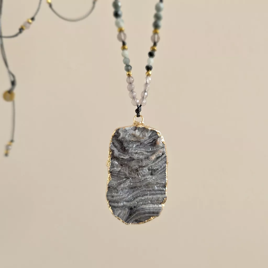 Naszyjnik regulowany unikat agat druza, jadeit, orle oko, jaspis żyłkowy, labradoryt, kwarc dymny i hematyt na czarnym sznurku v.2