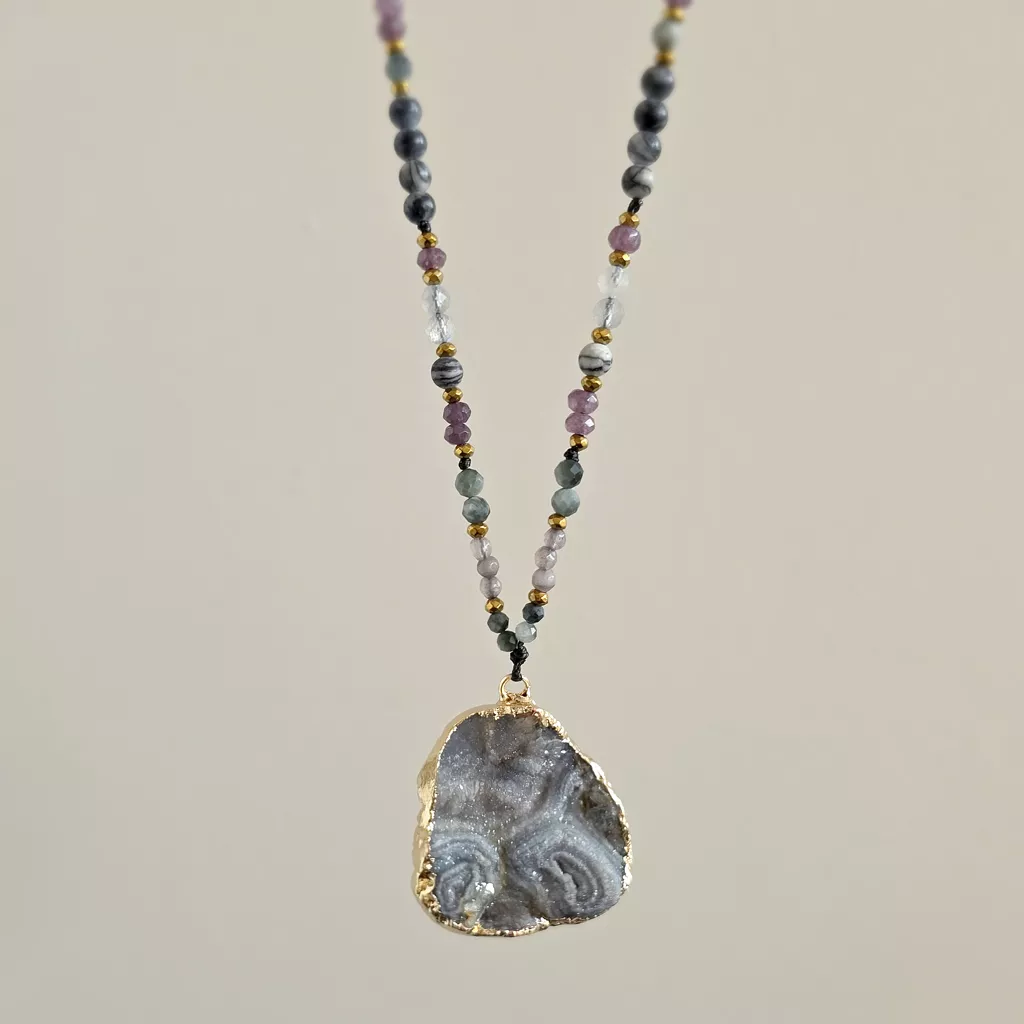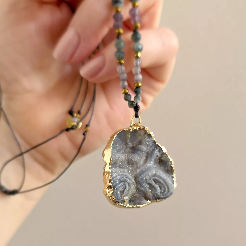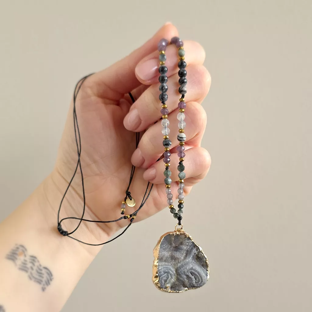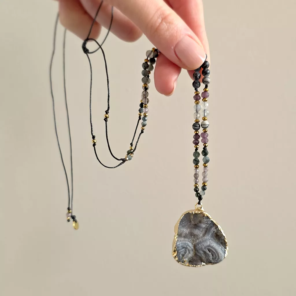 Naszyjnik regulowany unikat agat druza, jadeit, orle oko, jaspis żyłkowy, labradoryt, kwarc dymny i hematyt na czarnym sznurku