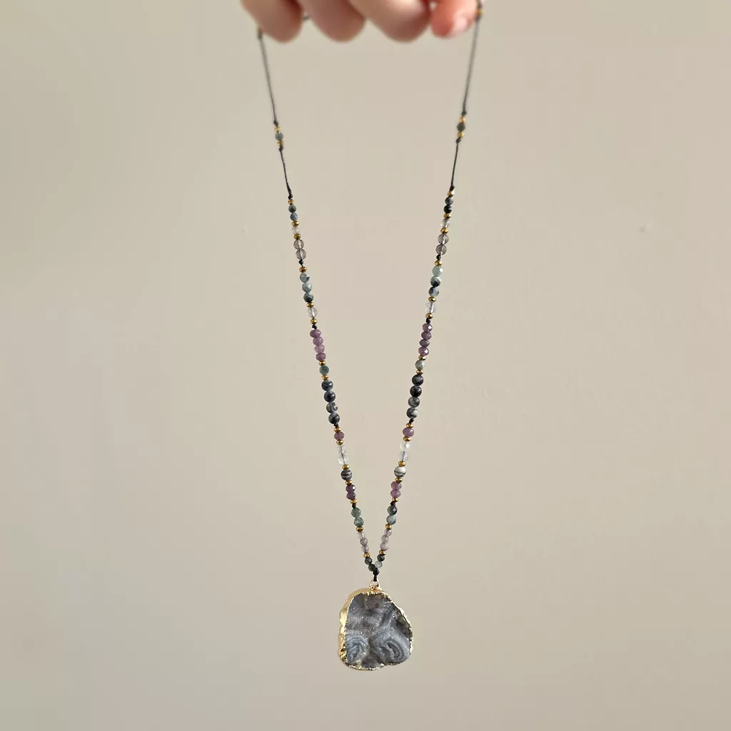 Naszyjnik wykonany z kamieni naturalnych - zawieszki agatu z druzą, jadeitu, orlego oka, jaspisu żyłkowego, labradorytu, kwarcu dymnego i hematytu. Podstawę naszyjnika stanowi mocny sznurek, wykończenie - stal chirurgiczna.