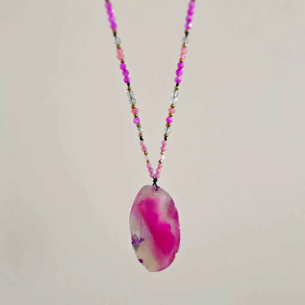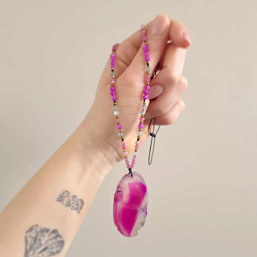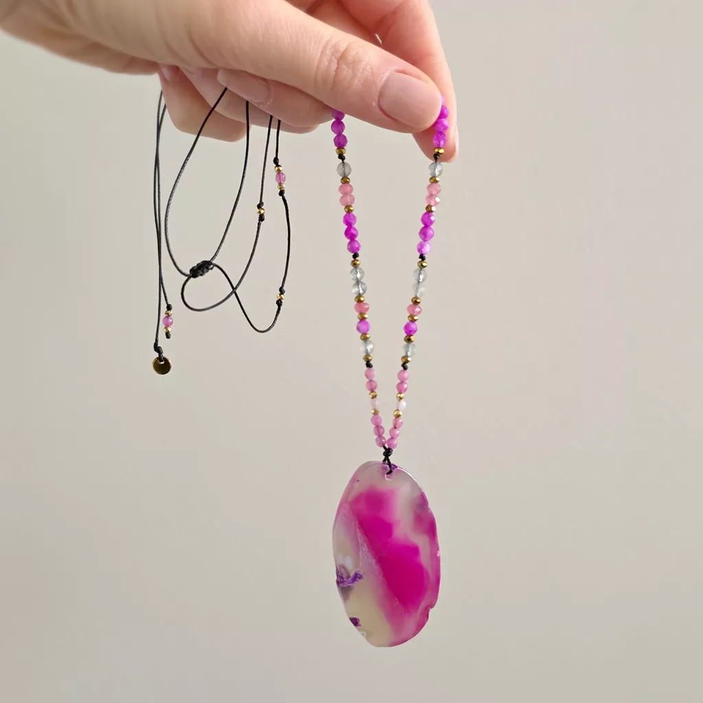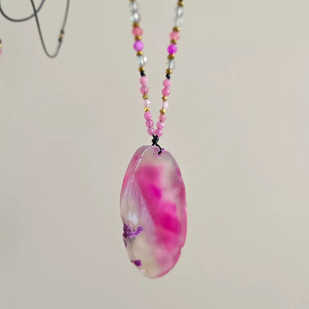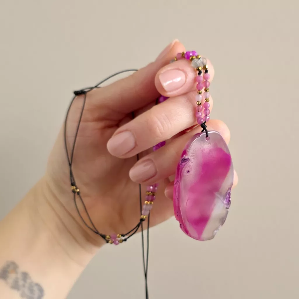 Naszyjnik wykonany z kamieni naturalnych - barwionego na różowo agatu, kwarcu różowego, jadeitu i hematytu. Podstawę naszyjnika stanowi mocny sznurek, wykończenie - stal chirurgiczna.
