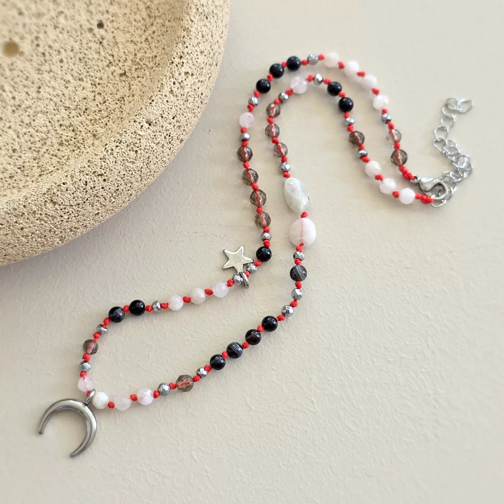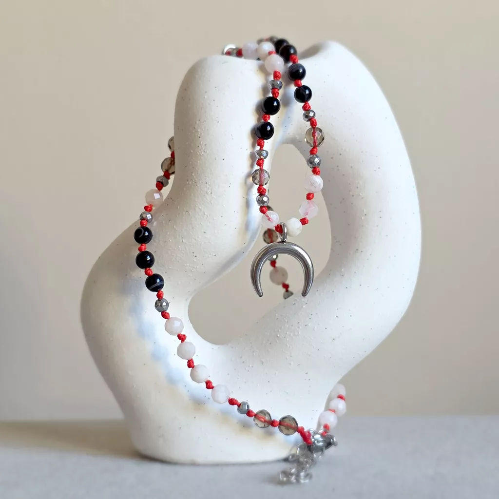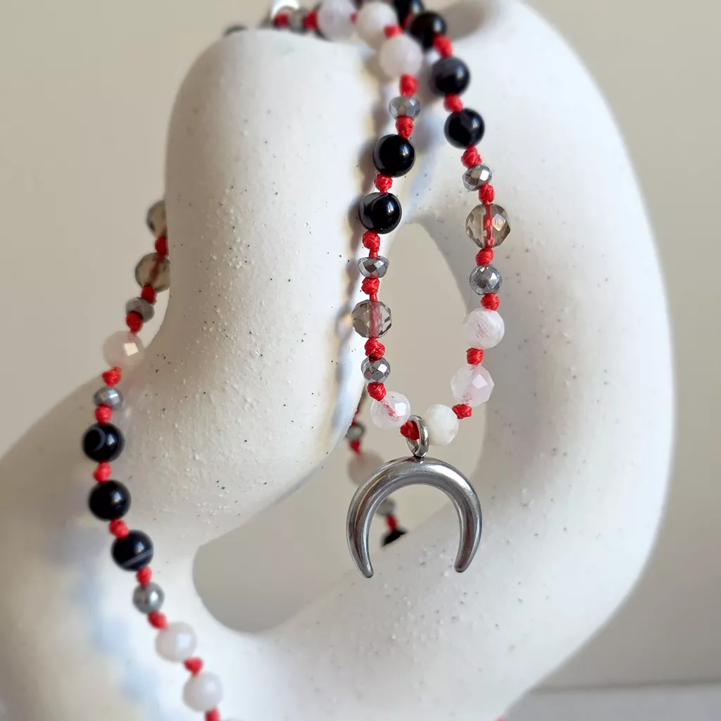 Ten unikatowy naszyjnik supełkowany łączy w sobie głęboką, stabilną energię ziemi z subtelną, intuicyjną lekkością. Kompozycja czarnego agatu, kamienia księżycowego, kwarcu dymnego i hematytu została osadzona na intensywnym, czerwonym sznurku, który dodaje całości mocy i wyrazistości.