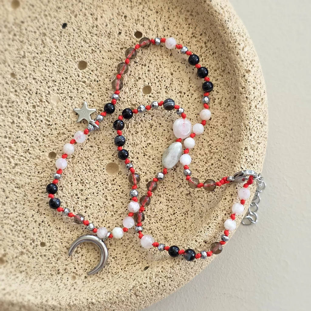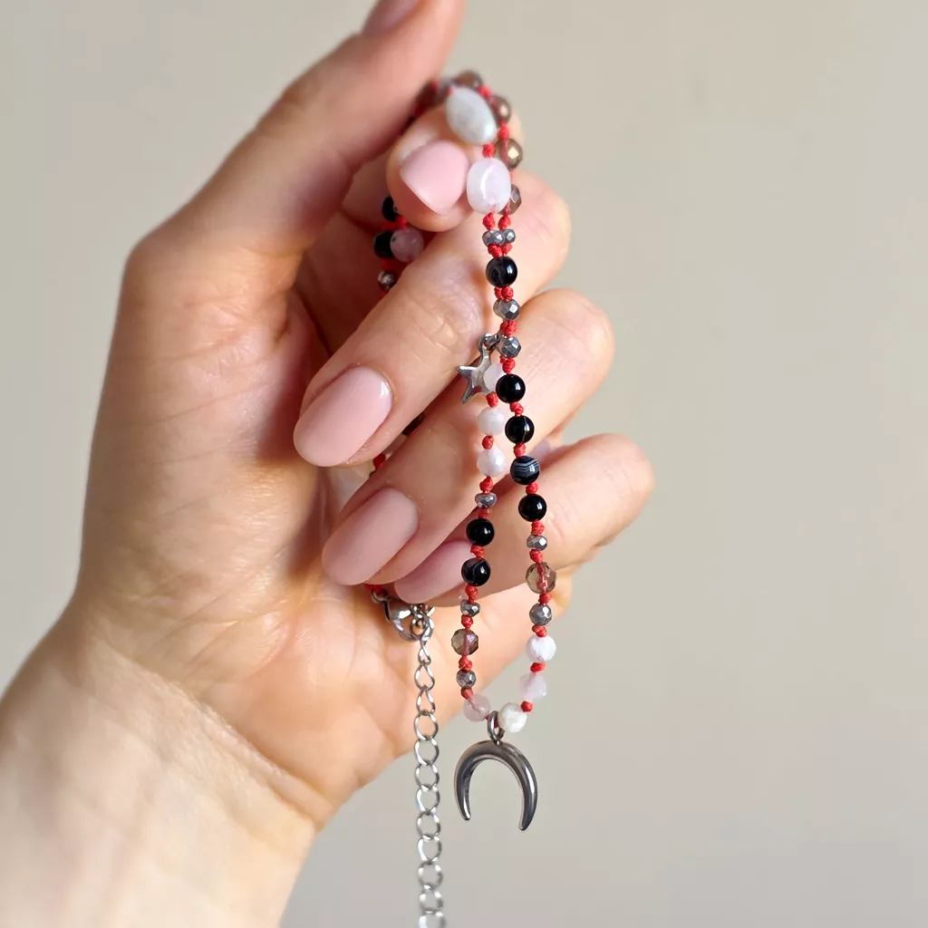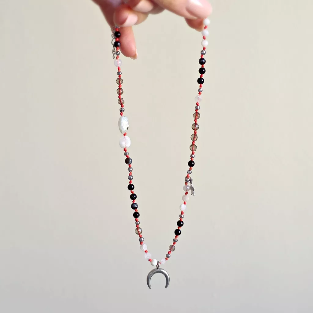 Ten unikatowy naszyjnik supełkowany łączy w sobie głęboką, stabilną energię ziemi z subtelną, intuicyjną lekkością. Kompozycja czarnego agatu, kamienia księżycowego, kwarcu dymnego i hematytu została osadzona na intensywnym, czerwonym sznurku, który dodaje całości mocy i wyrazistości.