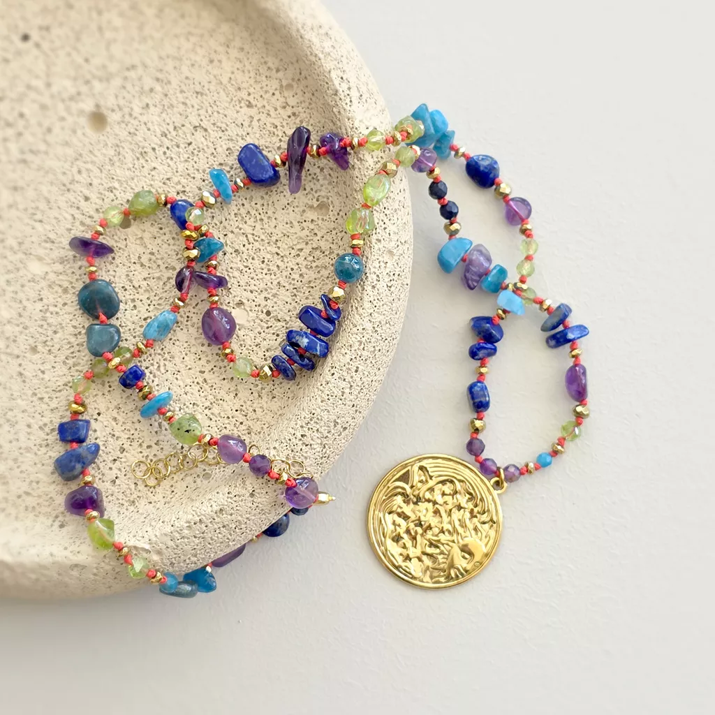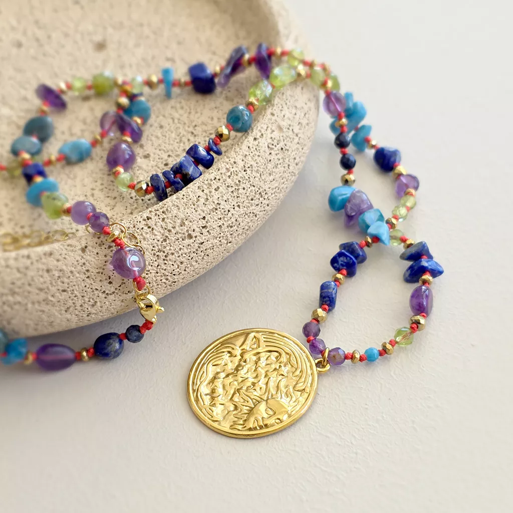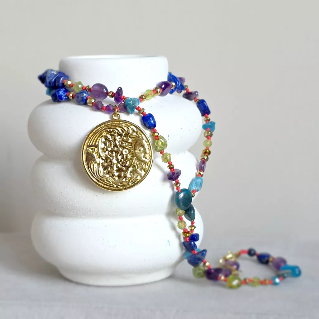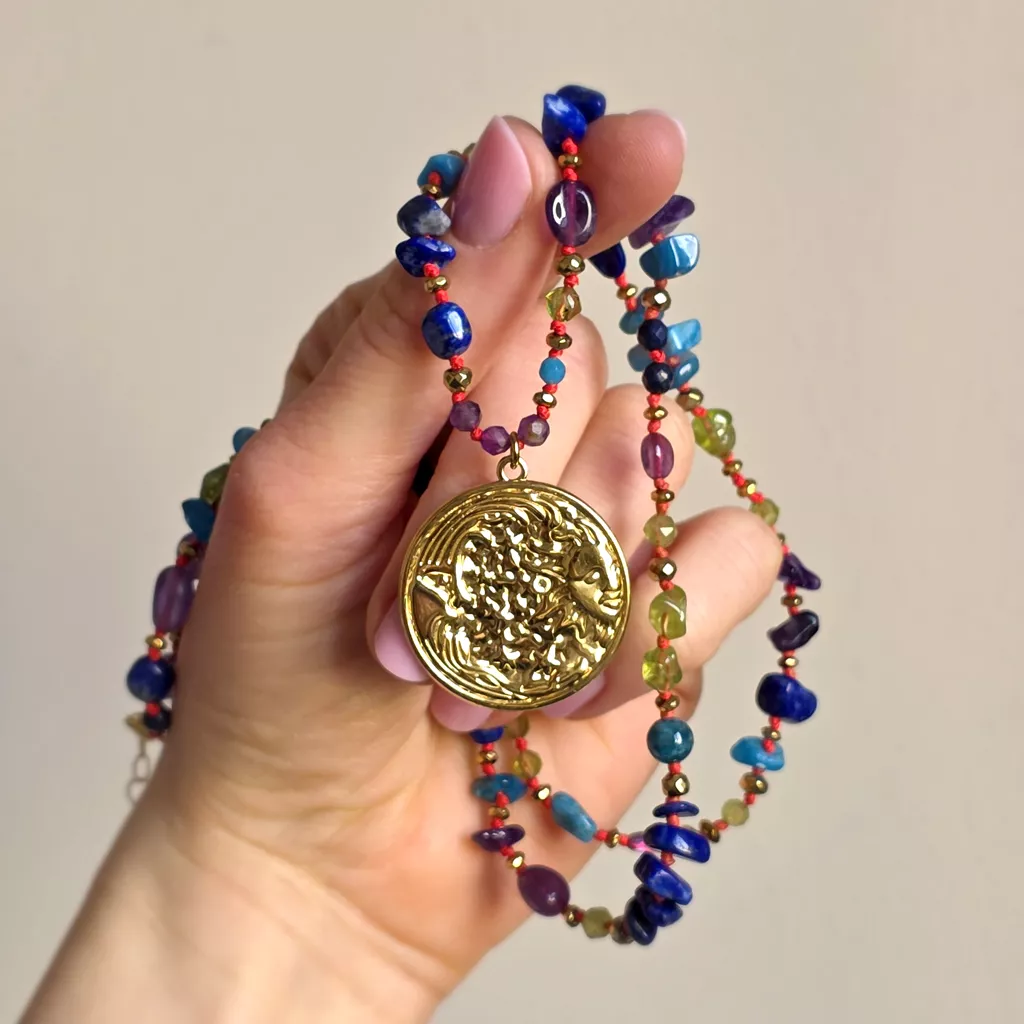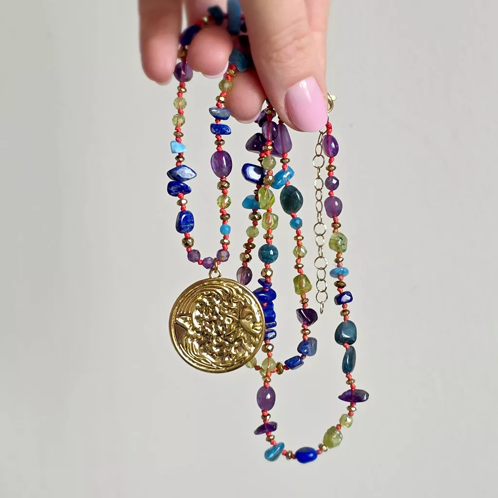 Supełkowany naszyjnik na czerwonym sznurku przyciąga uwagę intensywną, wielobarwną kompozycją kamieni i wyraźnym kontrastem między nasyconymi barwami a złotymi detalami. W układzie pojawiają się nieregularne bryłki i gładkie, owalne formy lapis lazuli w głębokim kobalcie, ametyst w odcieniach fioletu, apatyt w żywym błękicie oraz peridot w świeżej, jasnozielonej tonacji. Między kamieniami rozmieszczono drobne przekładki z hematytu w złotym kolorze, które porządkują rytm naszyjnika i podkreślają supełkowaną formę. Całość dopełnia ozdobna zawieszka słońce i księżyc oraz regulowane zapięcie z przedłużką.