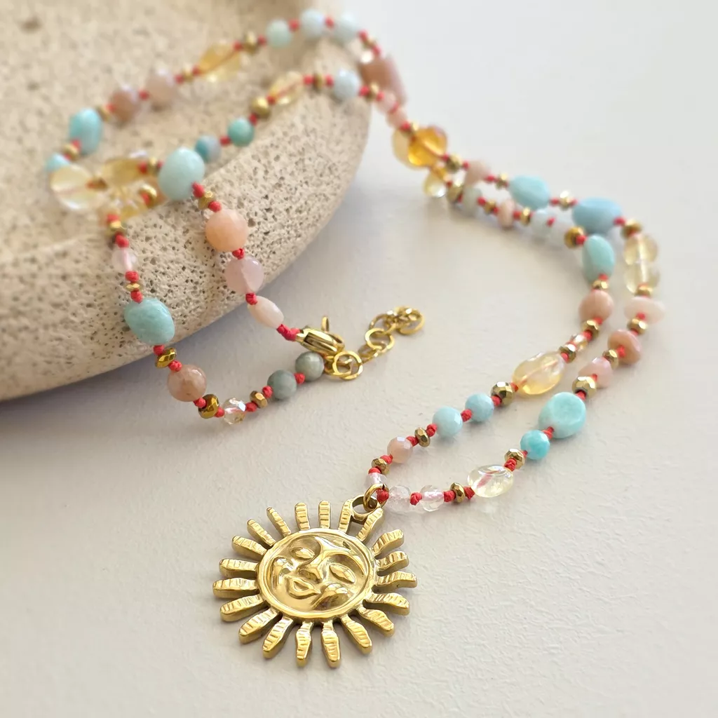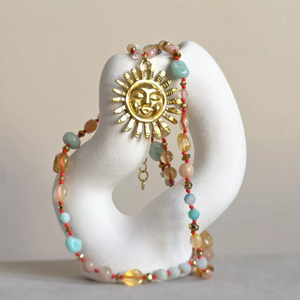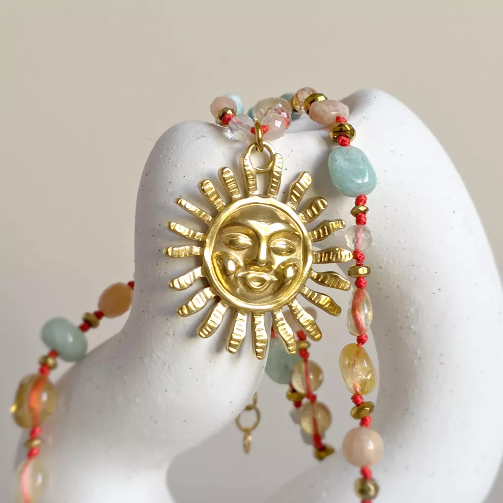 Supełkowany naszyjnik z cytrynem (prażony), amazonitem, kamieniem słonecznym i hematytem został wykonany na czerwonym sznurku, który mocno porządkuje całą kompozycję i wydobywa ciepłe, jasne tony kamieni. W układzie widać nieregularne bryłki i gładkie koraliki w odcieniach błękitu, miodowego żółtego, jasnej brzoskwini i pudrowego różu, przełamane złotym połyskiem hematytu. Zawieszka w formie słońca stanowi wyrazisty punkt centralny i dobrze domyka całość w lekkim, letnim stylu.