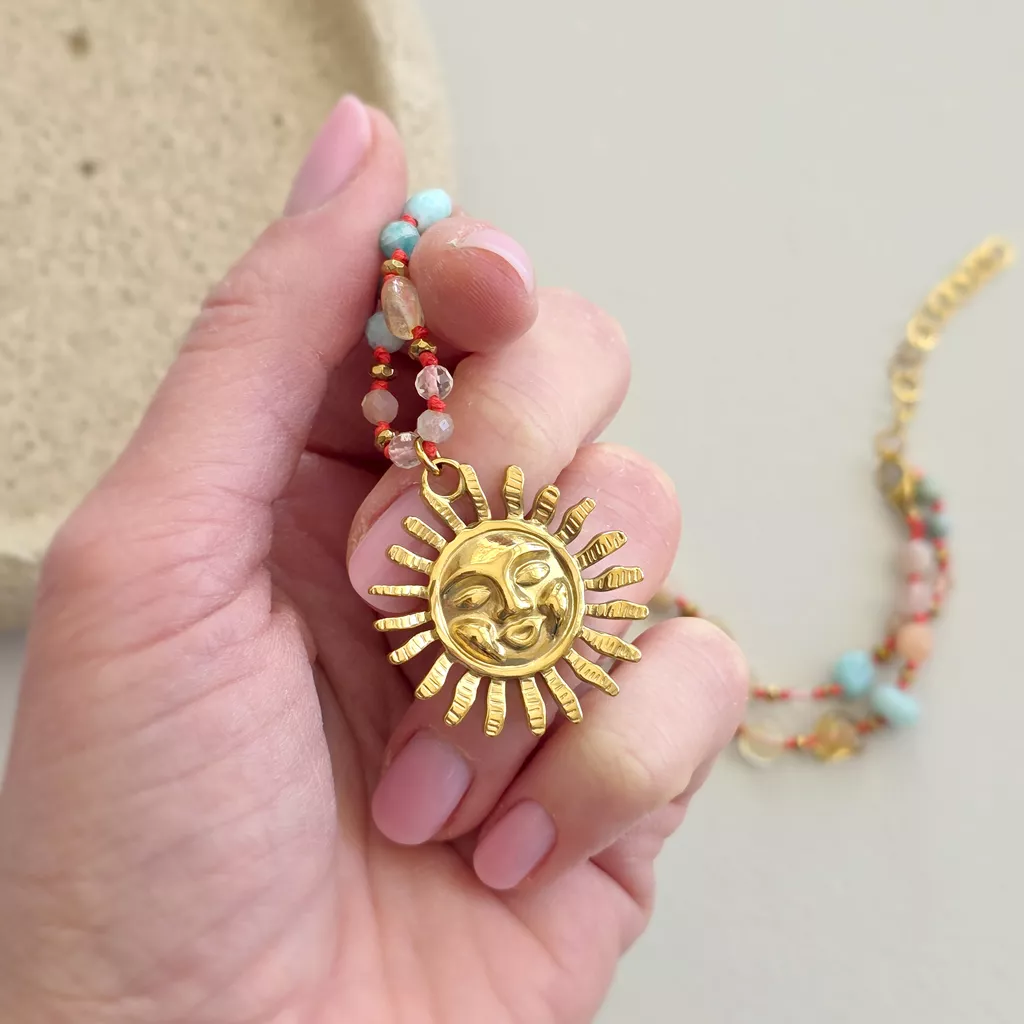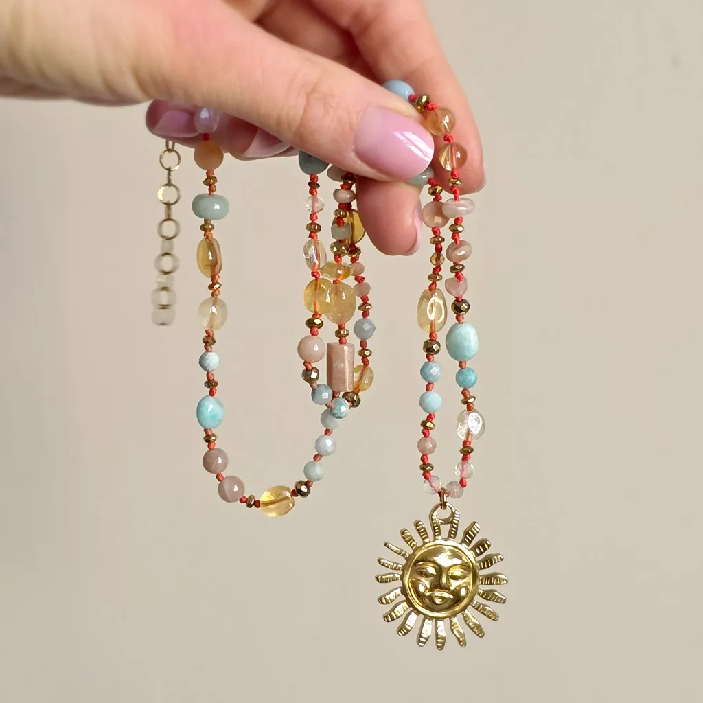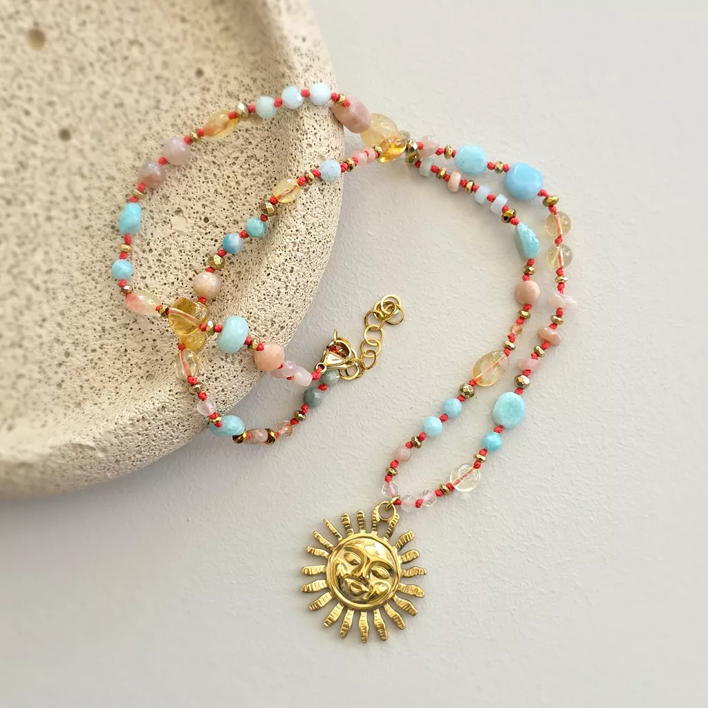 Supełkowany naszyjnik z cytrynem (prażony), amazonitem, kamieniem słonecznym i hematytem został wykonany na czerwonym sznurku, który mocno porządkuje całą kompozycję i wydobywa ciepłe, jasne tony kamieni. W układzie widać nieregularne bryłki i gładkie koraliki w odcieniach błękitu, miodowego żółtego, jasnej brzoskwini i pudrowego różu, przełamane złotym połyskiem hematytu. Zawieszka w formie słońca stanowi wyrazisty punkt centralny i dobrze domyka całość w lekkim, letnim stylu.