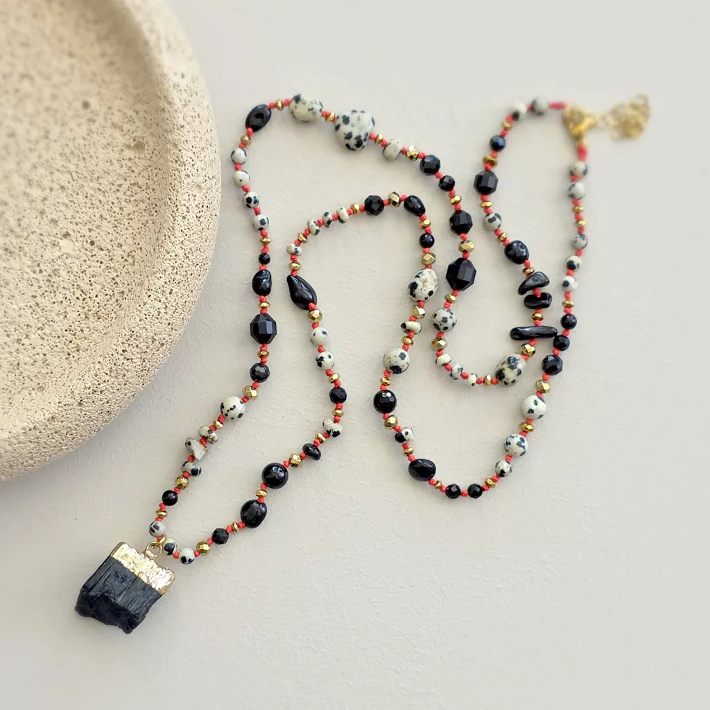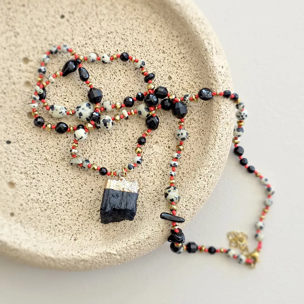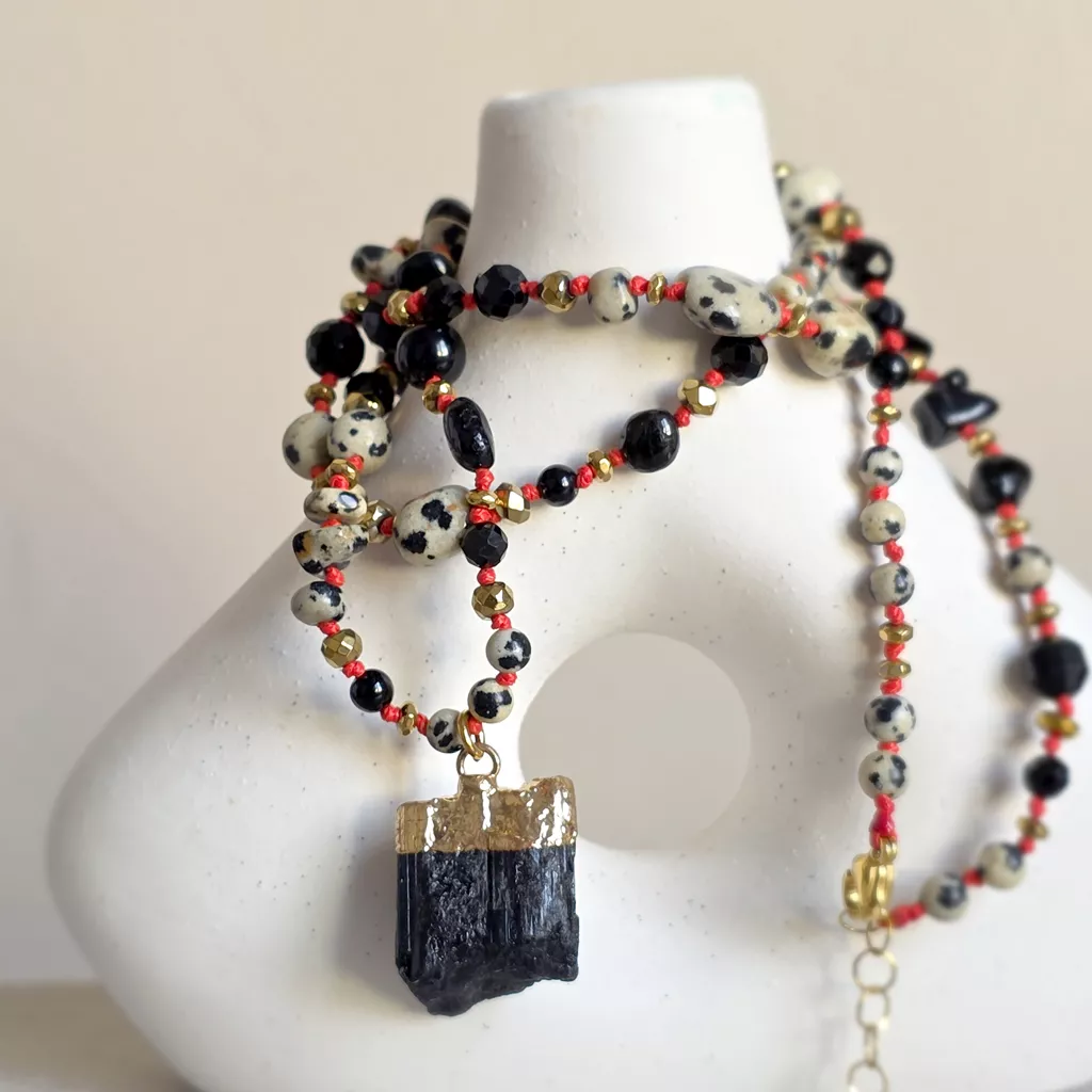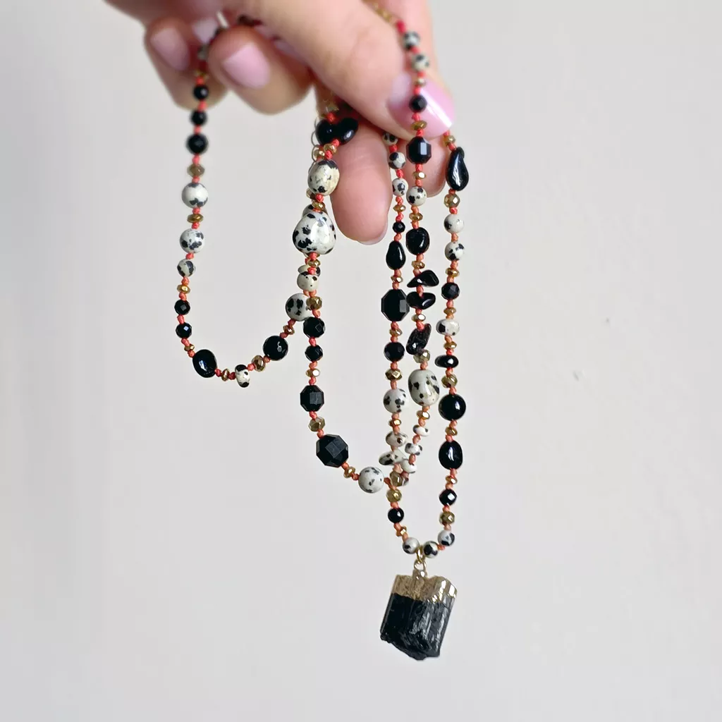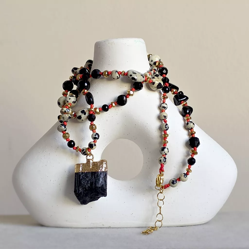Supełkowany naszyjnik na czerwonym sznurku został stworzony z kontrastowego zestawienia czerni, kremowej bieli i drobnych złotych akcentów. W kompozycji pojawiają się nieregularne oraz fasetowane elementy czarnego turmalinu o głębokim, ciemnym połysku, a także jaspis dalmatyński w jasnej tonacji z charakterystycznymi, czarnymi nakrapianiami. Całość porządkują złote przekładki z hematytu, które podkreślają rytm naszyjnika i wzmacniają wyrazisty kontrast kolorystyczny. Ozdobnym akcentem jest większa bryłka czarnego turmalinu umieszczona z przodu, która nadaje całości mocniejszy, bardziej surowy charakter (oprawa kamienia - pozłacana miedź).