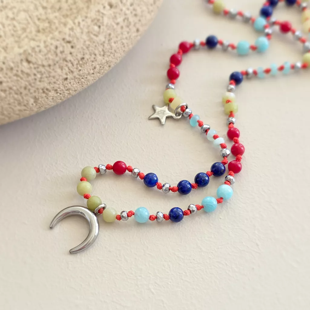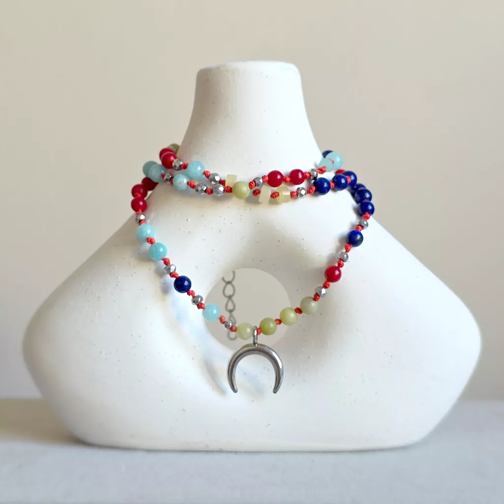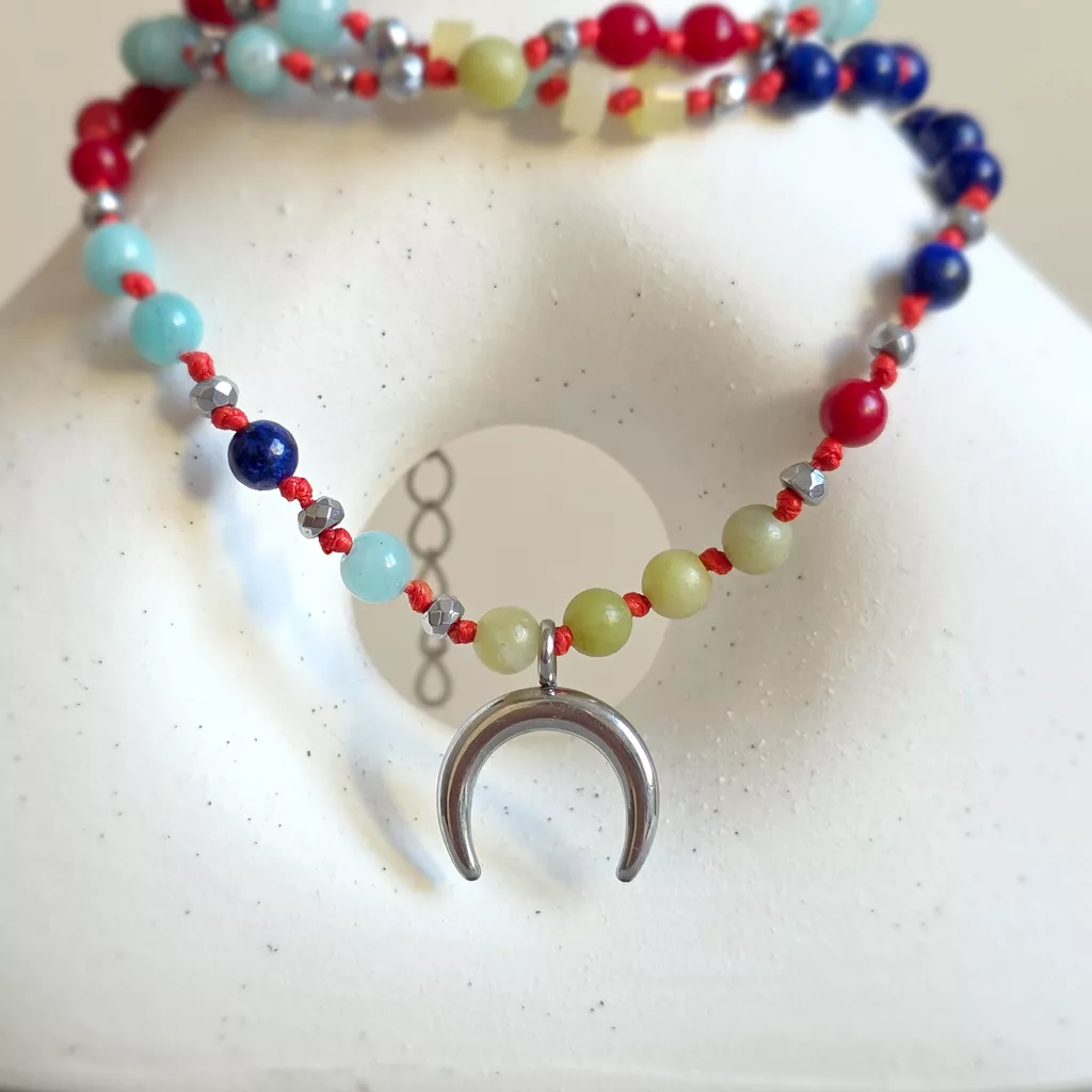 Naszyjnik supełkowany unikat jadeit, koral, lapis lazuli, amazonit i hematyt na czerwonym sznurku / zawieszka lunula