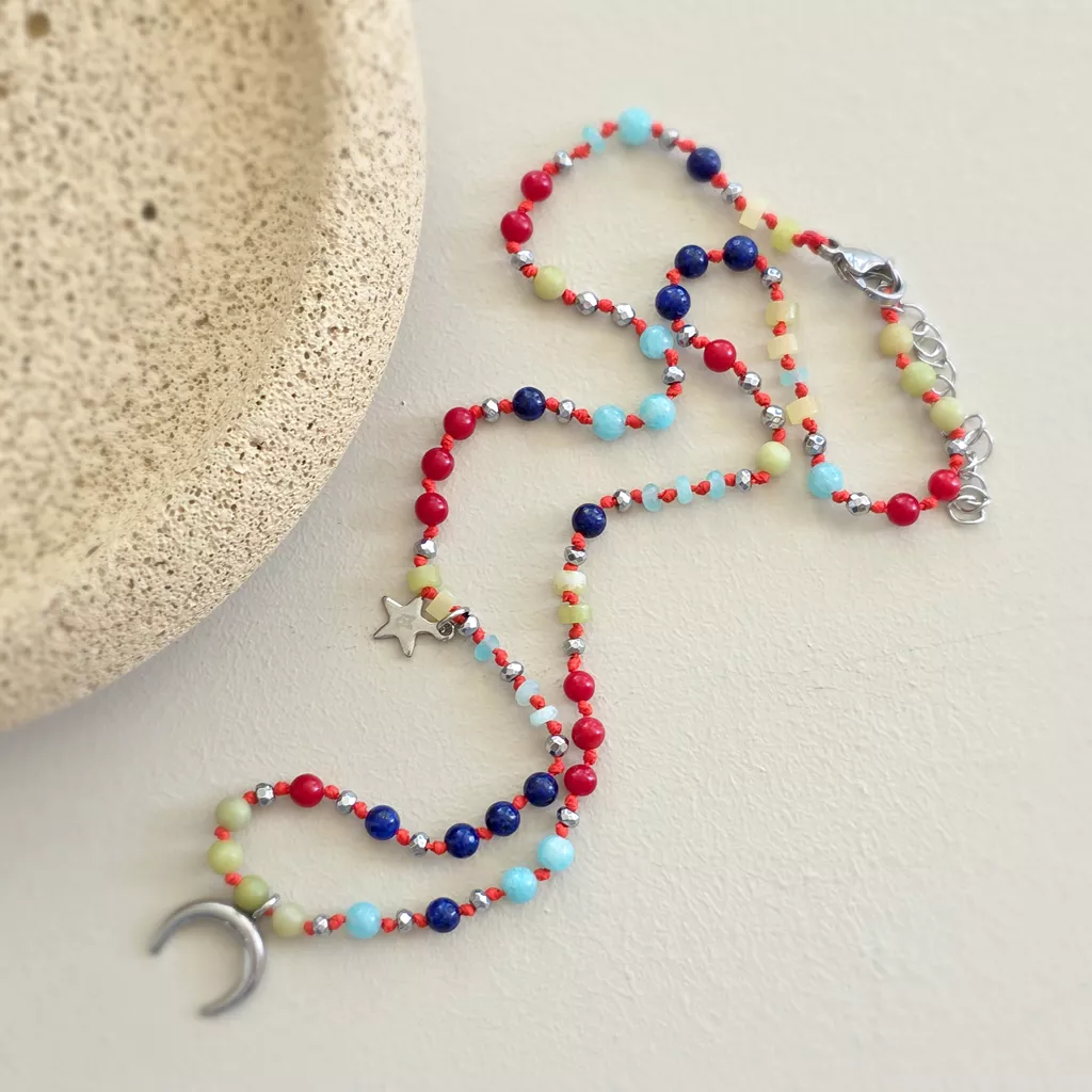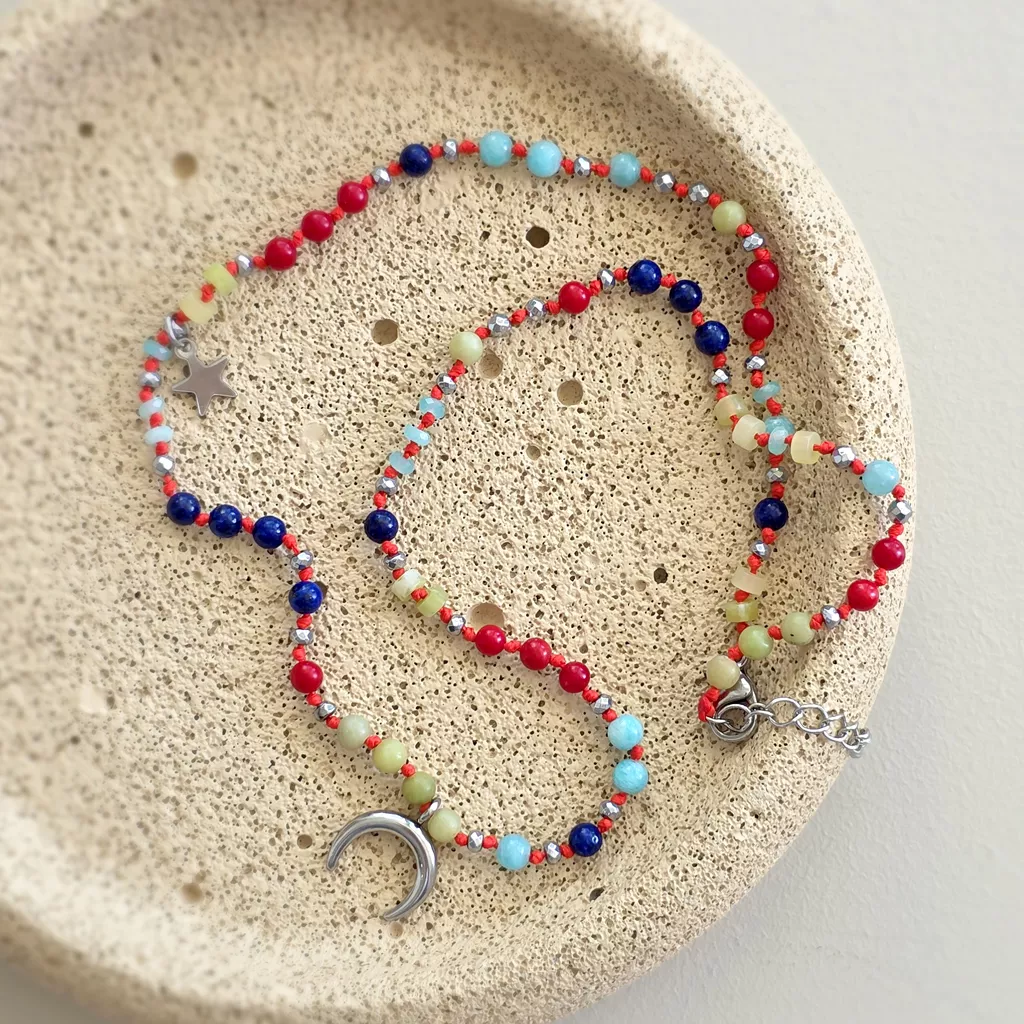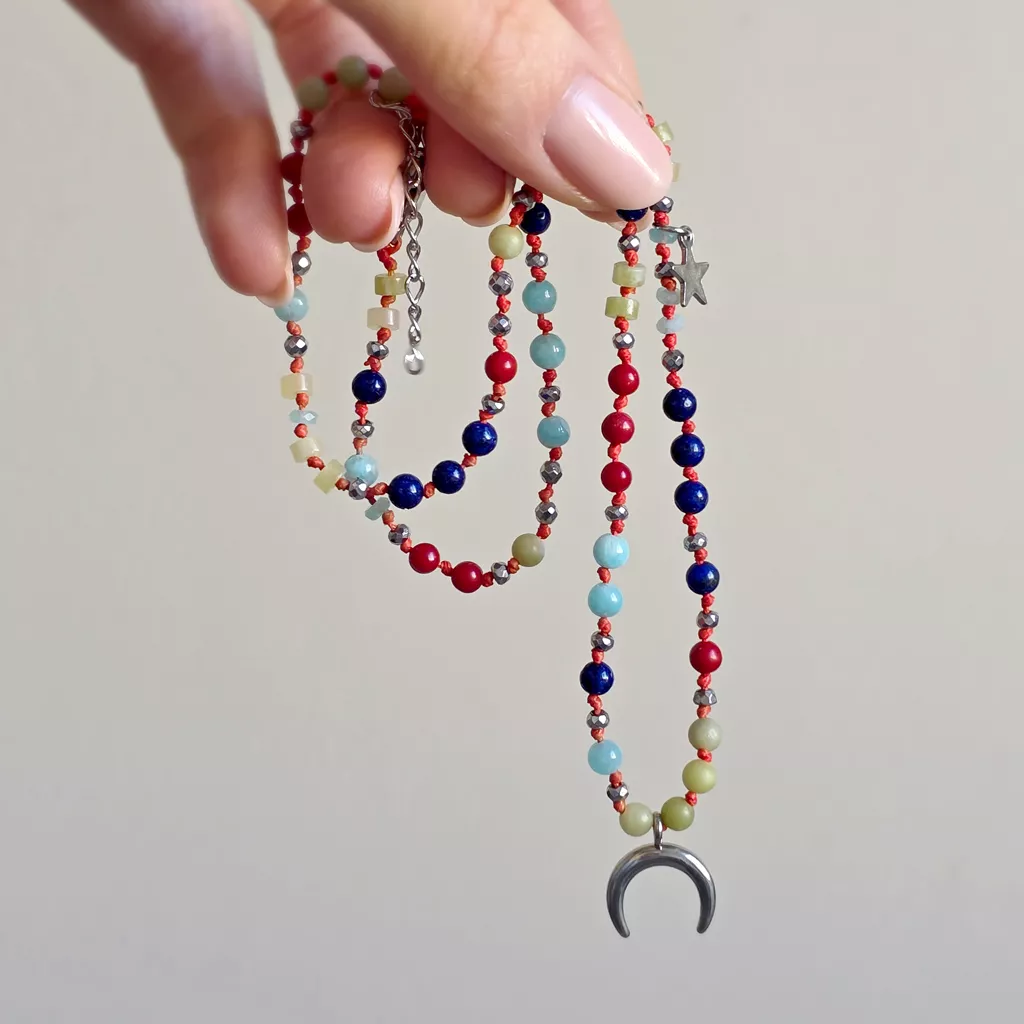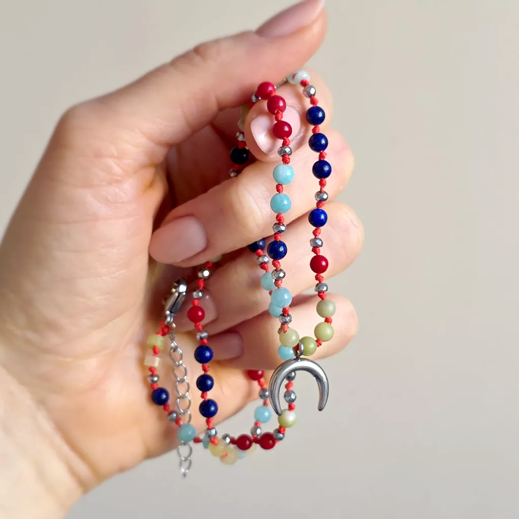 Naszyjnik supełkowany unikat jadeit, koral, lapis lazuli, amazonit i hematyt na czerwonym sznurku / zawieszka lunula