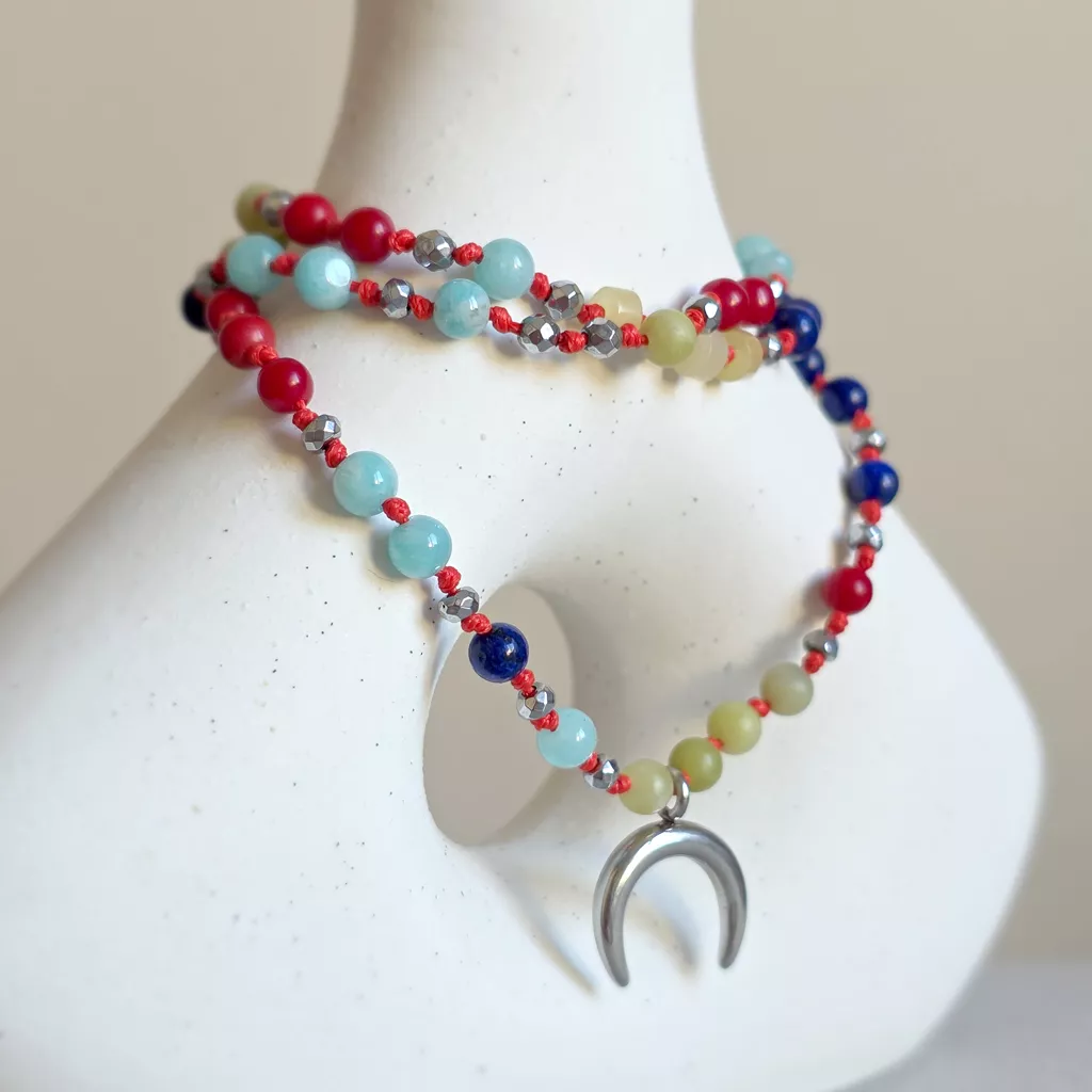 Ten unikatowy naszyjnik supełkowany to wyrazista kompozycja naturalnych kamieni i kobiecej symboliki, która łączy siłę, intuicję i równowagę. Połączenie jadeitu, koralu, lapis lazuli, amazonitu i srebrnego hematytu zostało osadzone na intensywnym, czerwonym sznurku, który wzmacnia energię działania i podkreśla charakter całej formy.