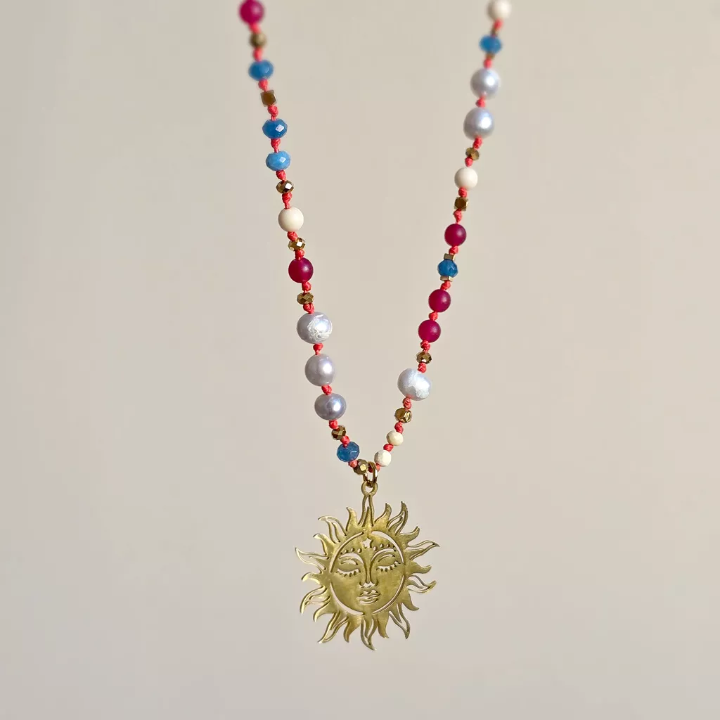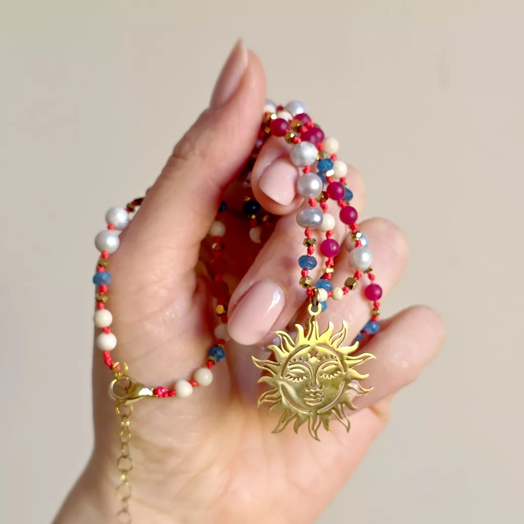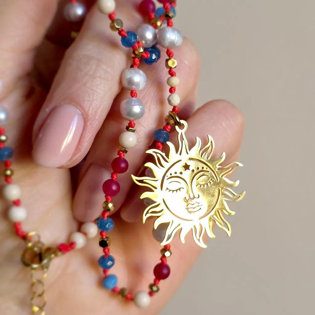 Centralnym elementem jest złota zawieszka słońce – symbol energii życia, jasności i wewnętrznego światła. W tej kompozycji działa jak spokojne źródło mocy, które rozświetla, ale nie dominuje.