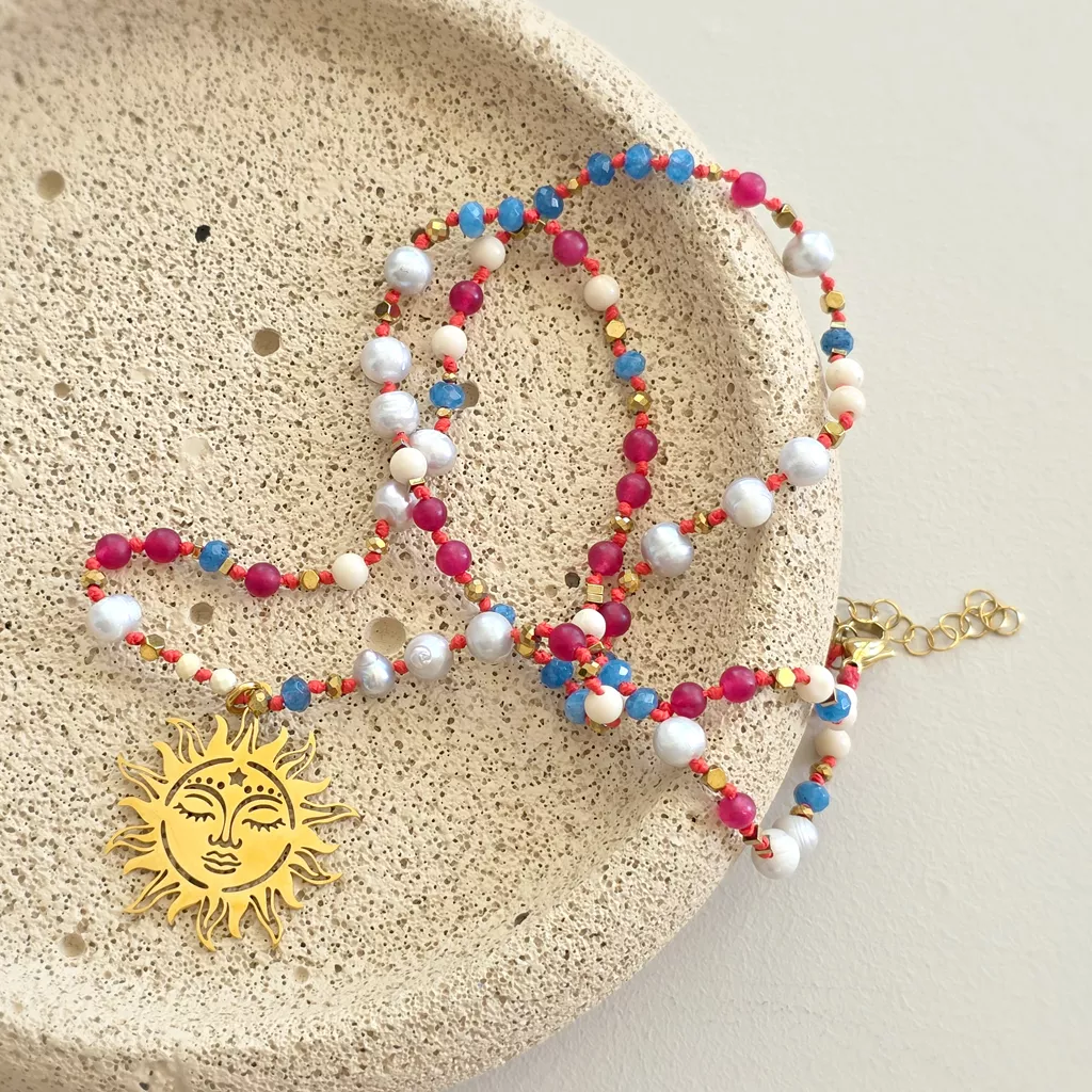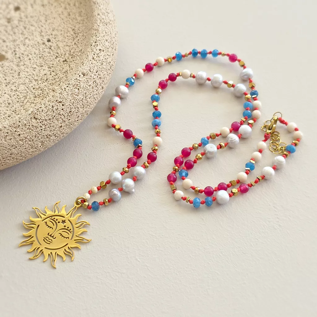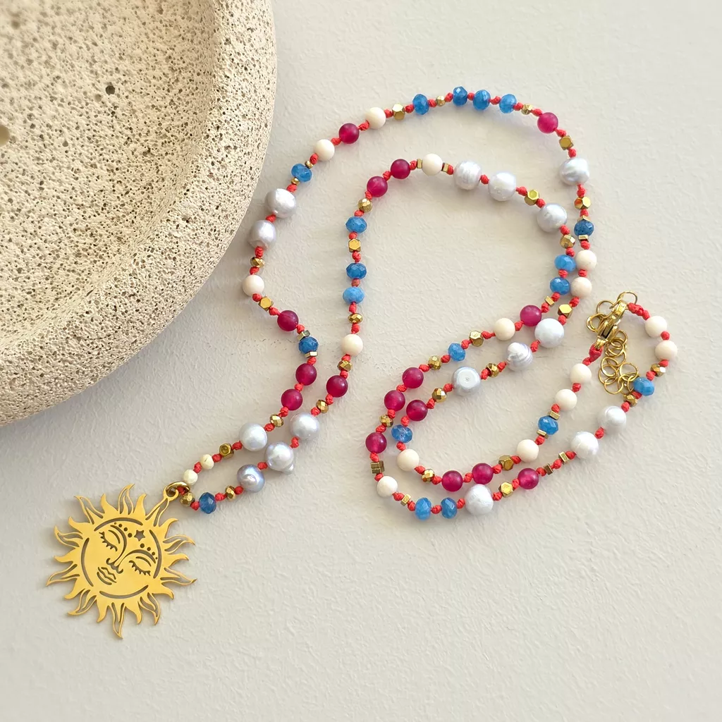 Centralnym elementem jest złota zawieszka słońce – symbol energii życia, jasności i wewnętrznego światła. W tej kompozycji działa jak spokojne źródło mocy, które rozświetla, ale nie dominuje.
