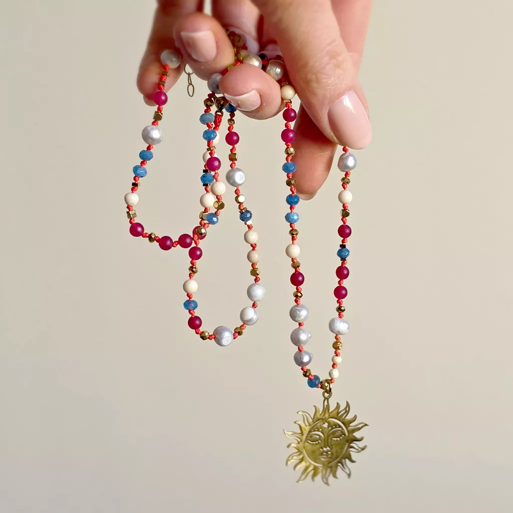 Ten unikatowy naszyjnik supełkowany to harmonijna kompozycja naturalnych kamieni, w której spokój spotyka się ze światłem. Połączenie kamienia rzecznego, agatu, jadeitu, naturalnych pereł w odcieniach delikatnych szarości oraz złotego hematytu zostało osadzone na intensywnym, czerwonym sznurku, tworząc wyrazistą, a jednocześnie bardzo zrównoważoną całość.