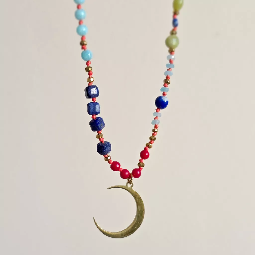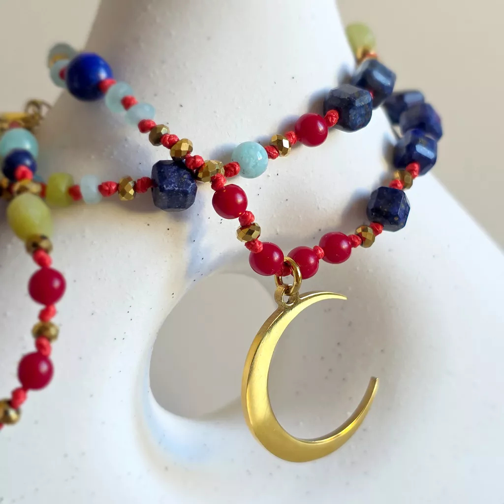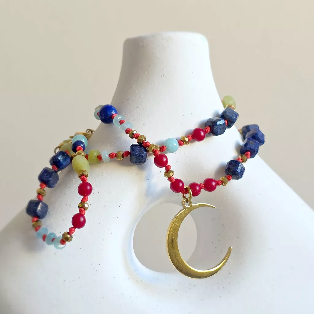 Naszyjnik supełkowany unikat koral, lapis lazuli, jadeit, amazonit i hematyt na czerwonym sznurku / zawieszka księżyc w nowiu