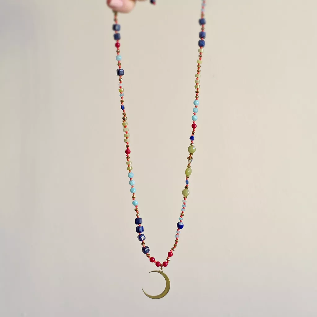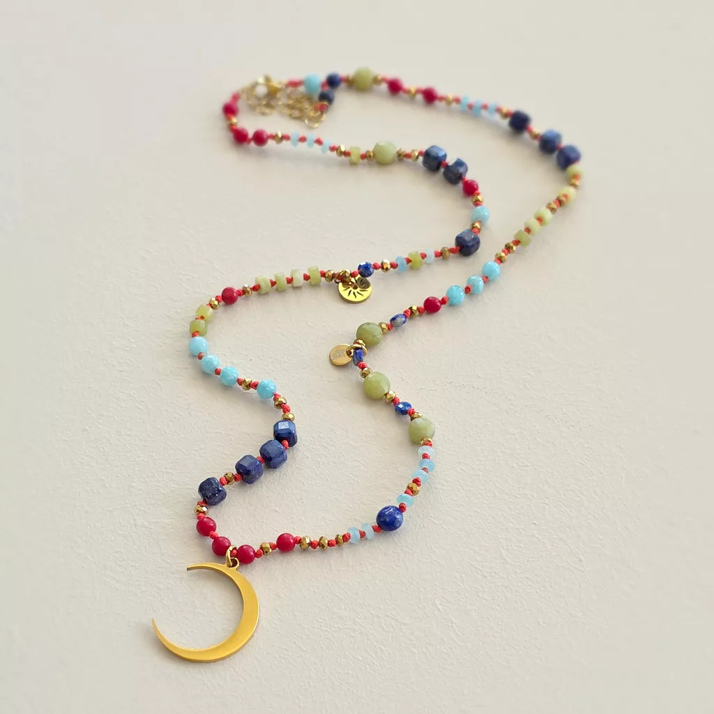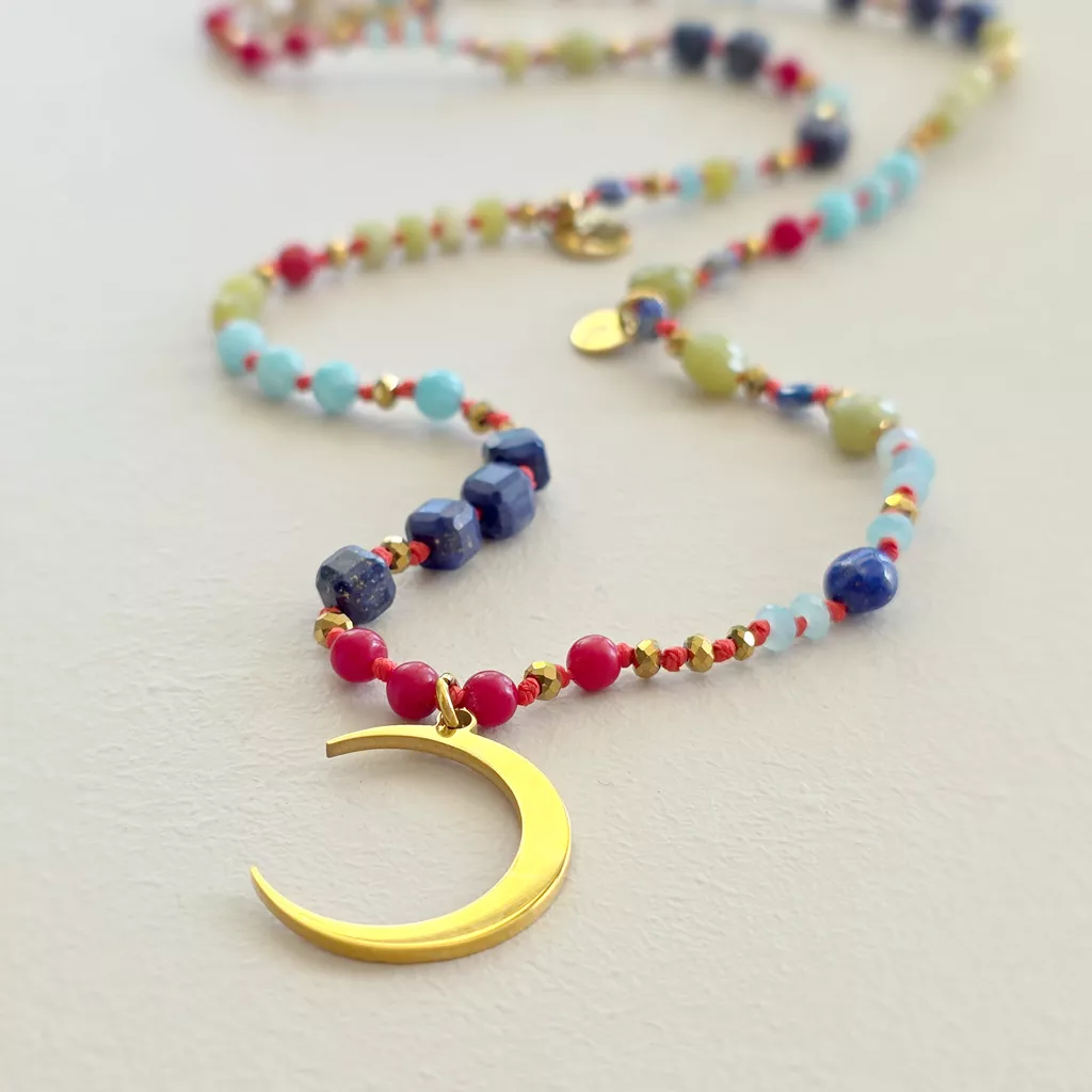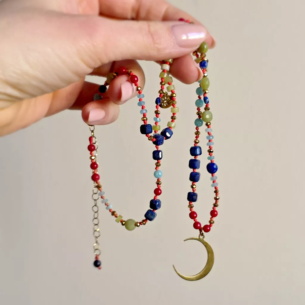 Naszyjnik supełkowany unikat koral, lapis lazuli, jadeit, amazonit i hematyt na czerwonym sznurku / zawieszka księżyc w nowiu