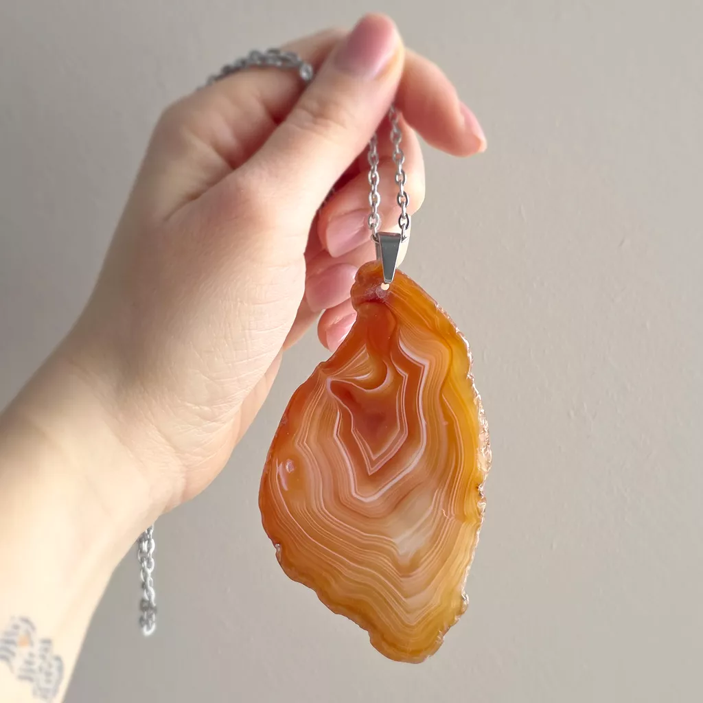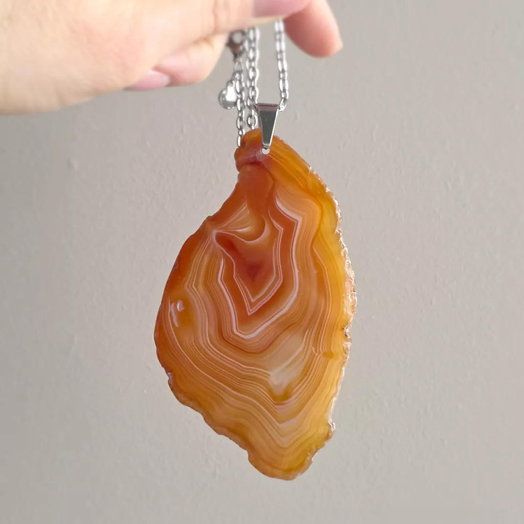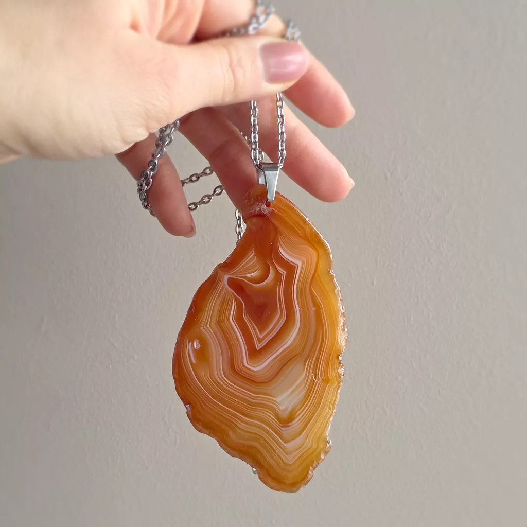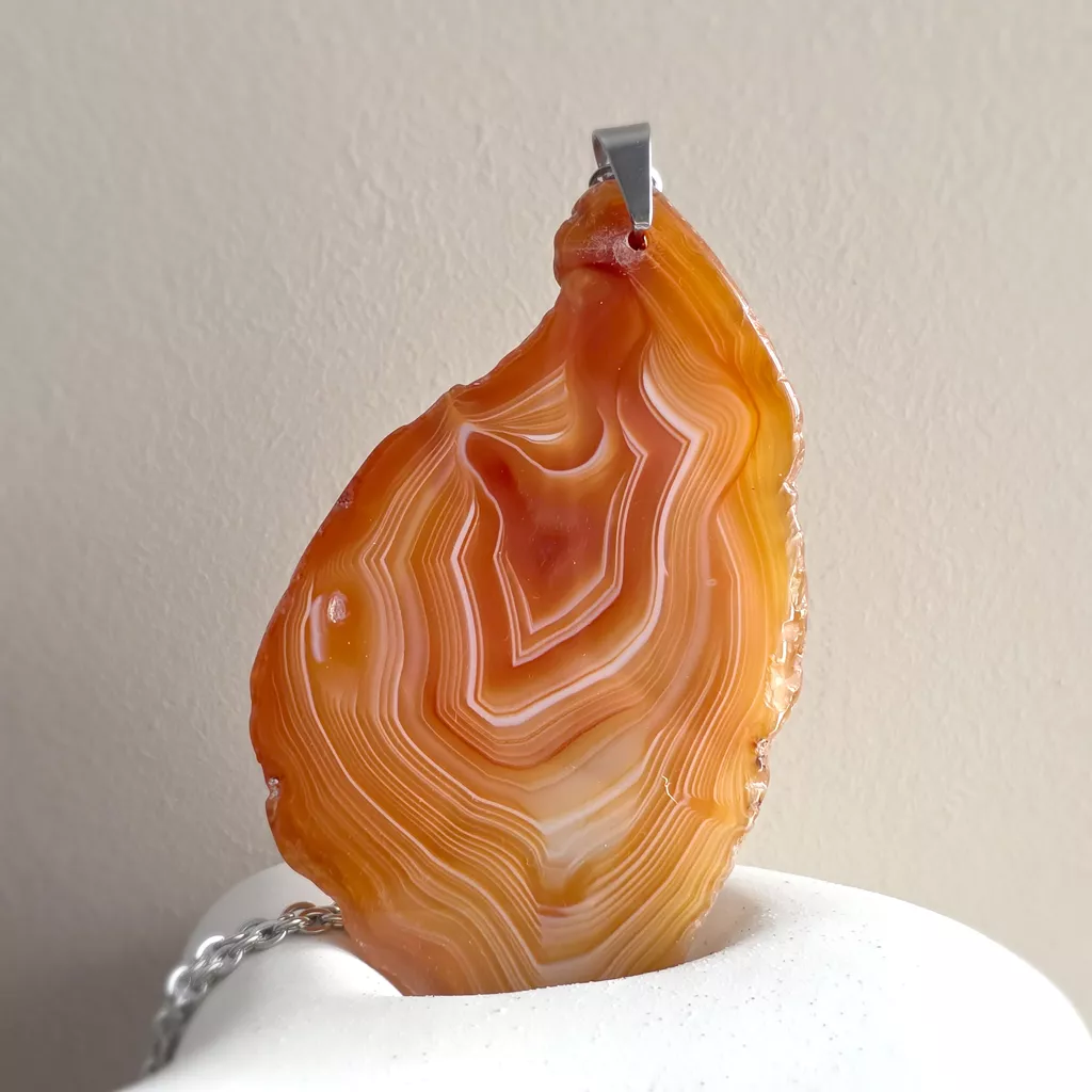 Naszyjnik wykonany z płaskiej płytki agatu pomarańczowego oraz łańcuszka ze stali chirurgicznej.