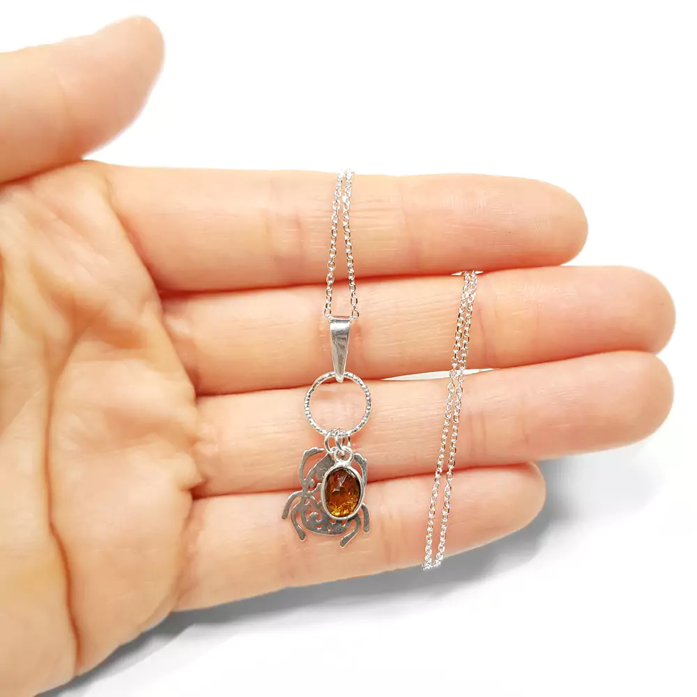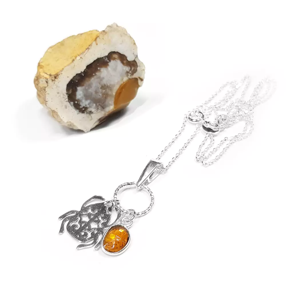 Naszyjnik wykonany z nieregularnego brązowego turmalinu zamkniętego w oprawie ze srebra p.925, zawieszki w kształcie skarabeusza oraz łańcuszka i grawerowanej blaszki z logo Magneska.