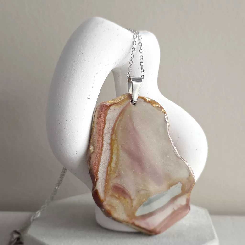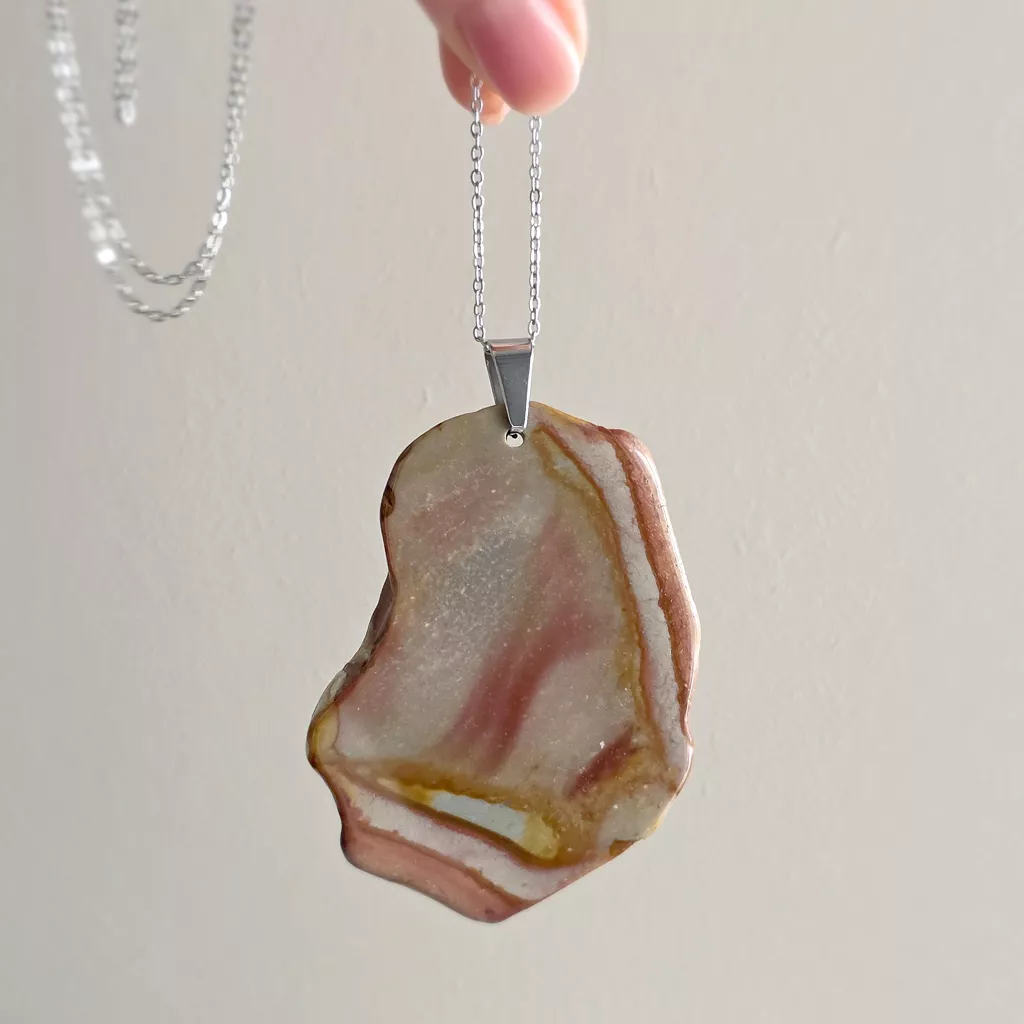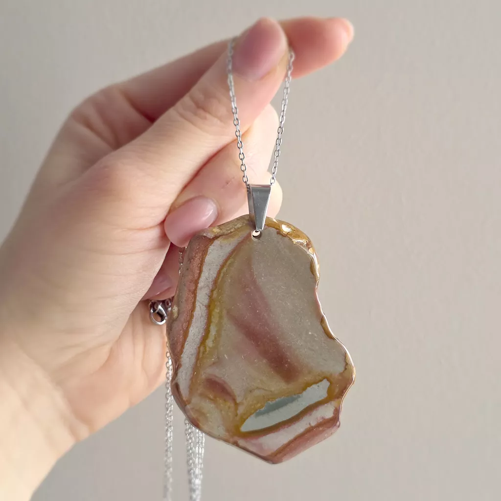 Naszyjnik wykonany z płaskiej płytki jaspisu polichromowego oraz łańcuszka ze stali chirurgicznej.