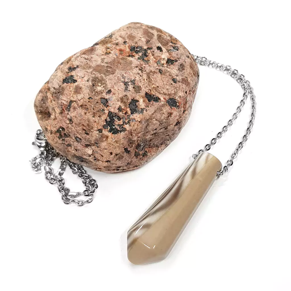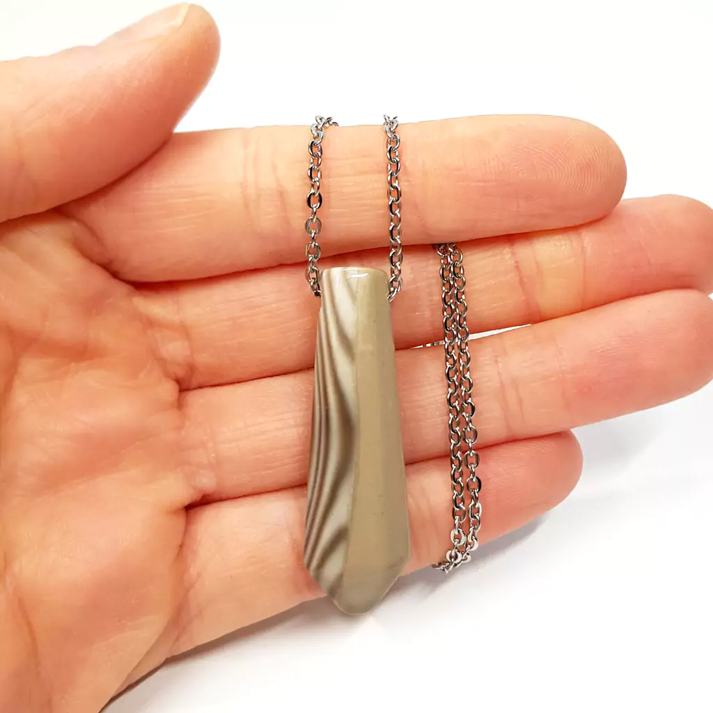 Naszyjnik wykonany z obelisku krzemienia pasiastego oraz łańcuszka ze stali chirurgicznej.