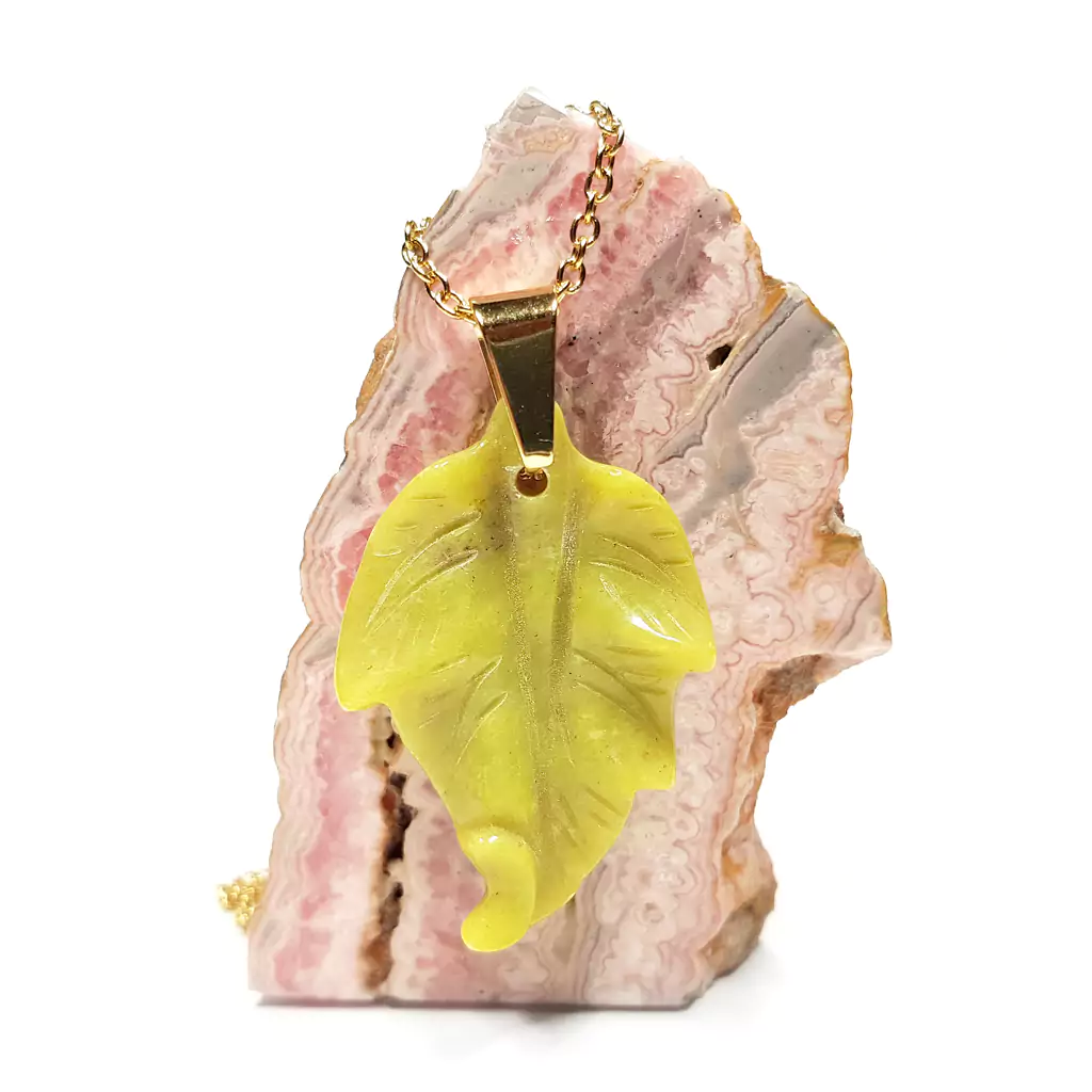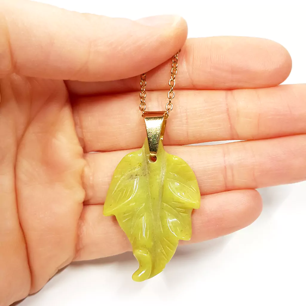 Naszyjnik wykonany z rzeźbionego na kształt listka jadeitu oraz łańcuszka ze stali chirurgicznej.