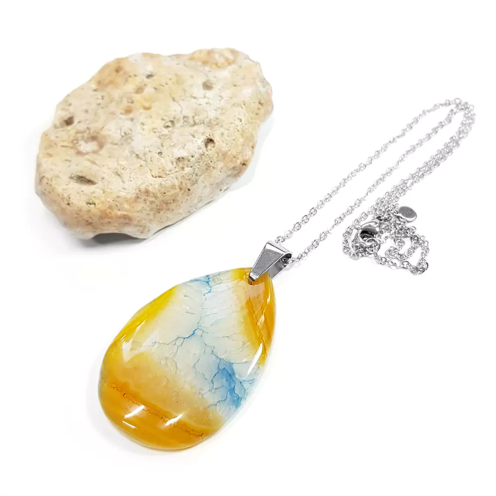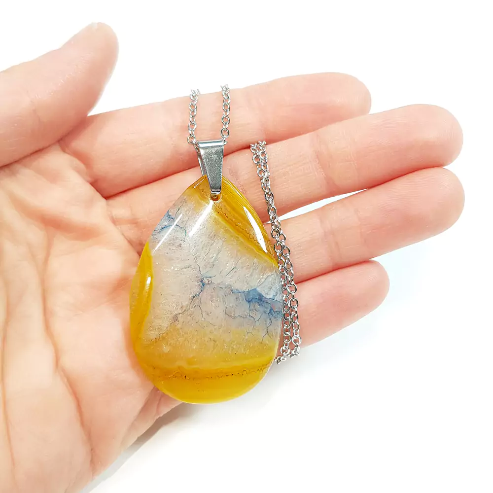 Naszyjnik wykonany z kropli żółtego agatu z barwionym na niebiesko kwarcem oraz łańcuszka ze stali chirurgicznej.