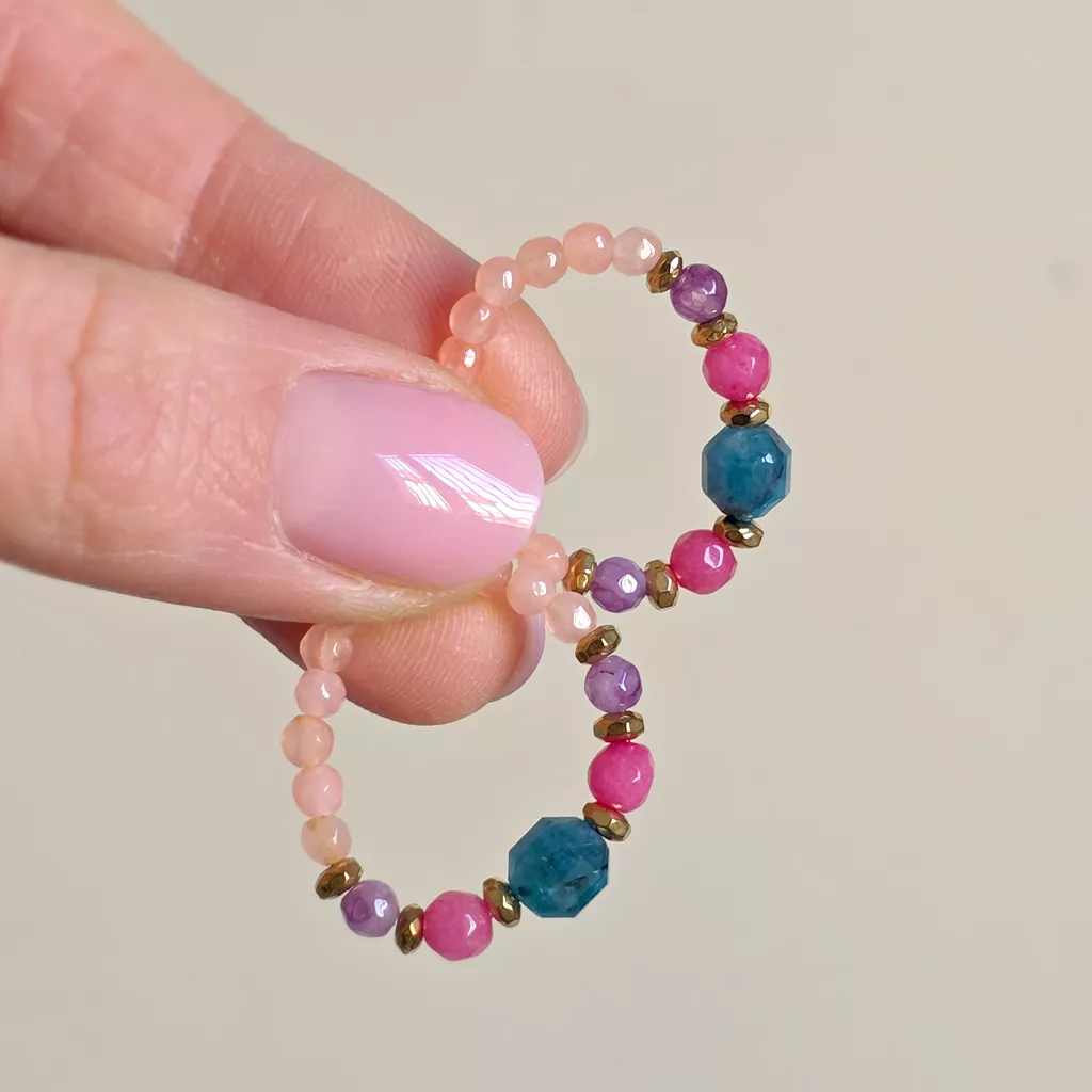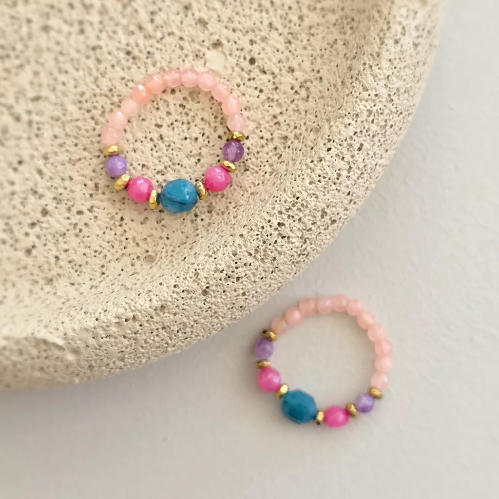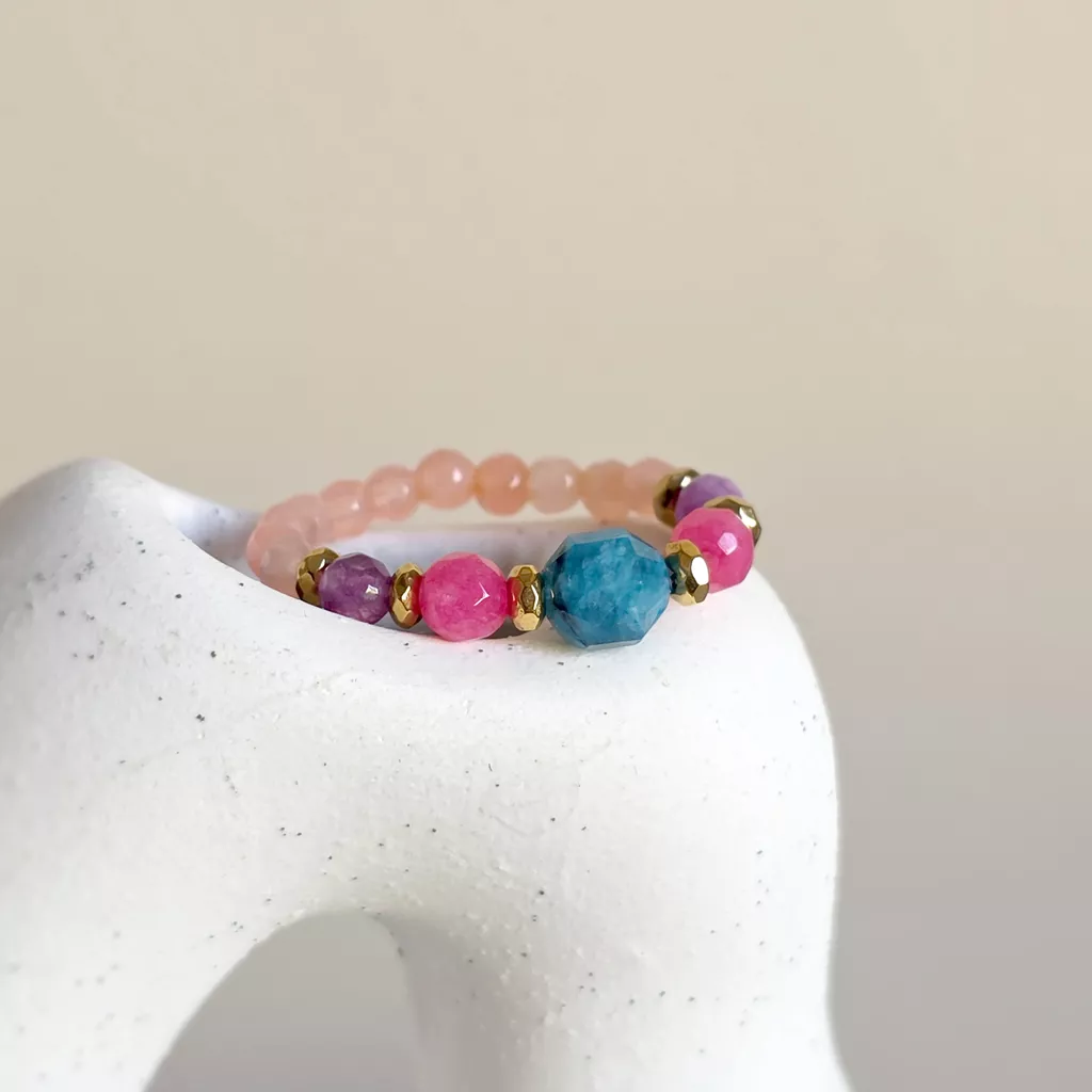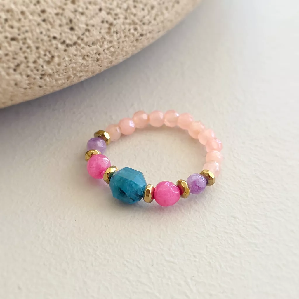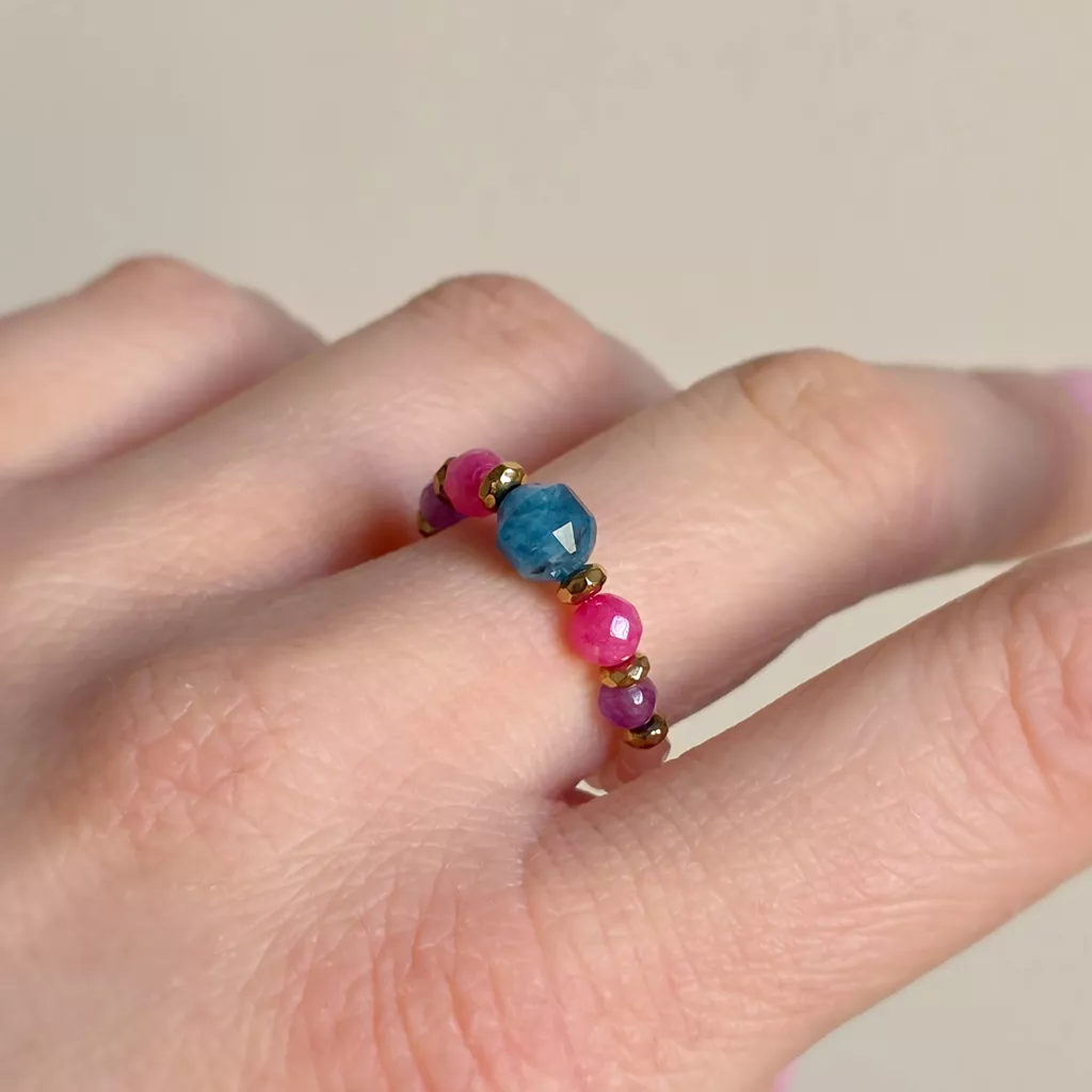 Elastyczny pierścionek został ułożony z drobnych kamieni o wyraźnie zróżnicowanej kolorystyce, zestawionych z połyskiem złotych przekładek. Centralnym elementem kompozycji jest większa bryłka (6 mm) niebieskiego apatytu o nieregularnym szlifie i intensywnym, morskim odcieniu. Towarzyszą jej kolorowe agaty w odcieniach jasnego różu, intensywnego różu i delikatnego fioletu, które nadają całości lekki, kontrastowy rytm. Złote elementy z hematytu porządkują układ kamieni i podkreślają dekoracyjny charakter pierścionka. Elastyczna forma sprawia, że dobrze dopasowuje się do palca.