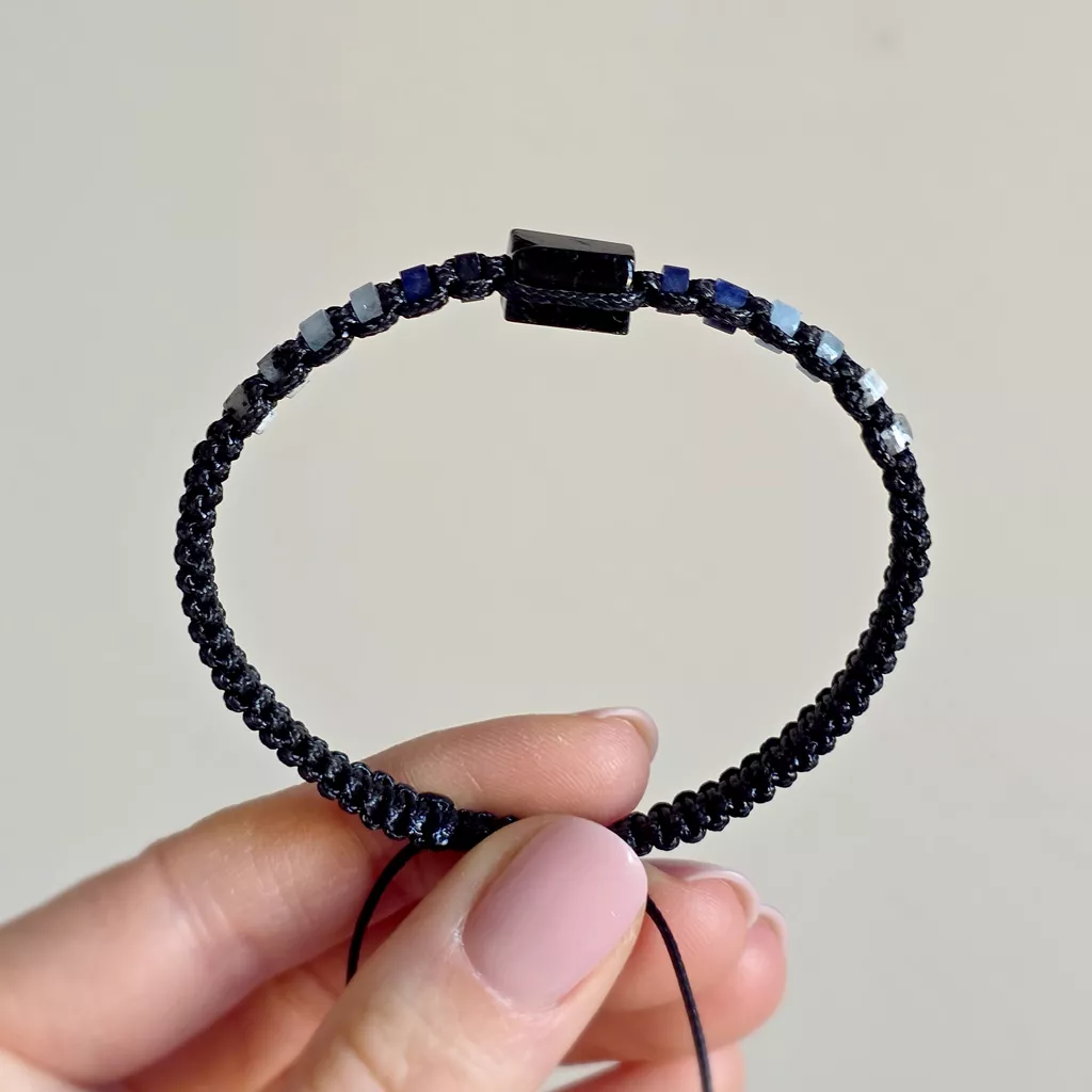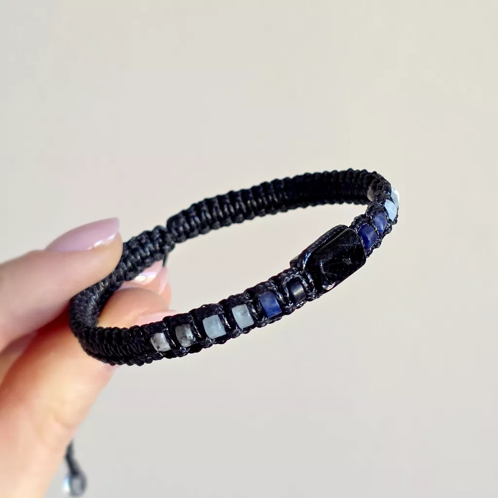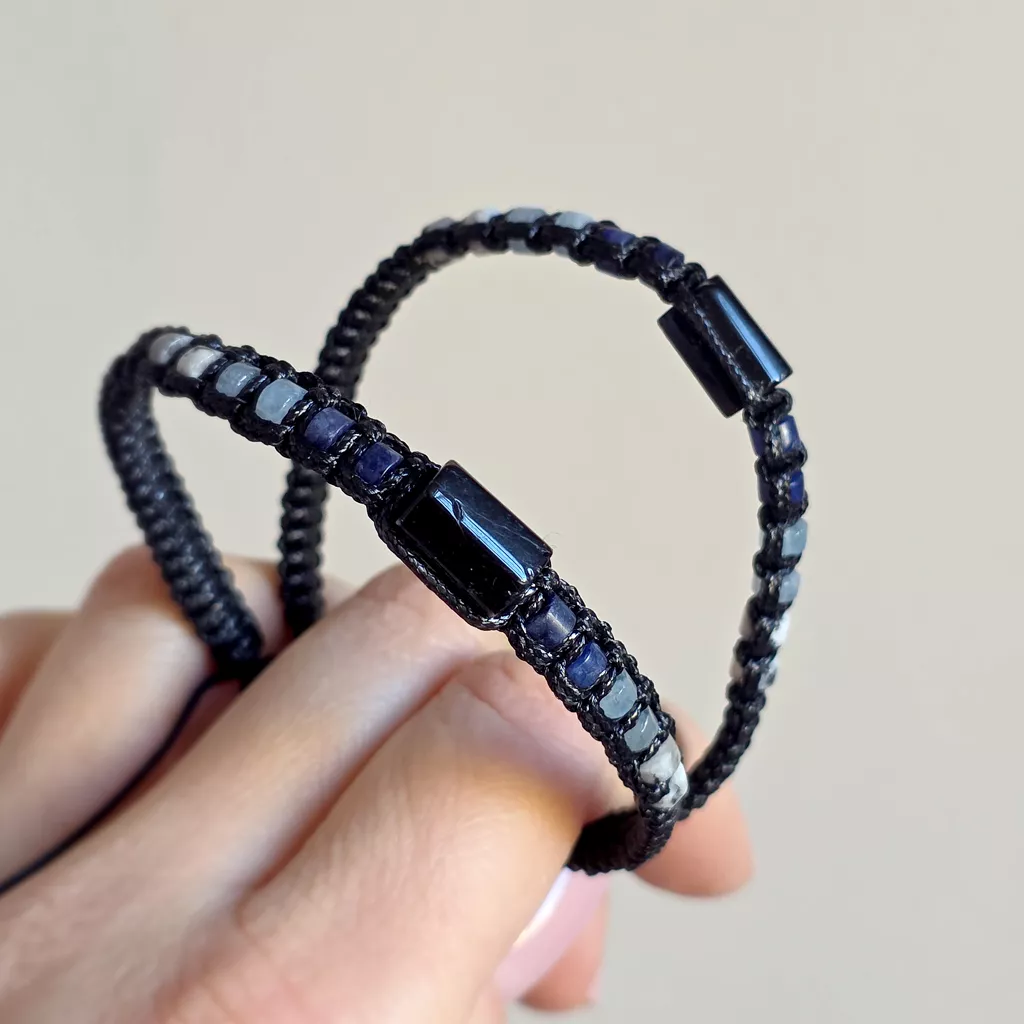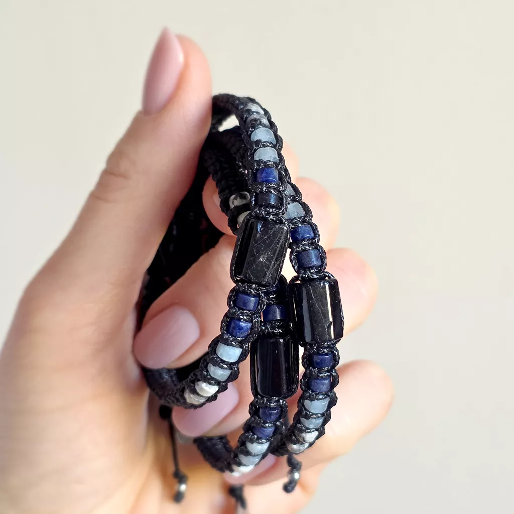Męska bransoletka makramowa z naturalnych kamieni to połączenie surowej elegancji i energii minerałów, które wspierają równowagę, koncentrację i spokój. Kompozycja czarnego turmalinu, sodalitu, akwamarynu i jaspisu lotus tworzy harmonijną biżuterię o wyrazistym, męskim charakterze.
