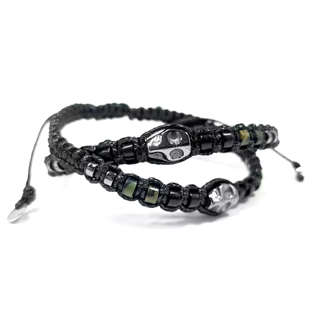 Bransoletka została wykonana z hematytowej czachy oraz talarków onyksu, jaspisu kambaba i hematytu. Podstawę stanowi mocny, nylonowy sznurek.